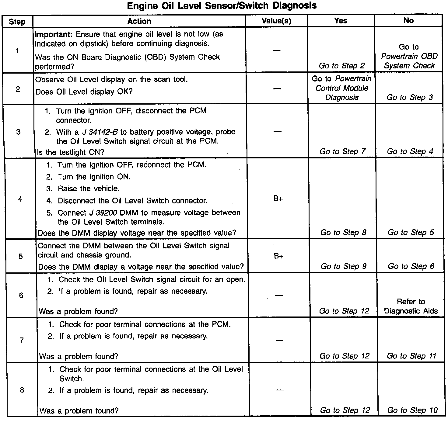 ^ Poor connection at PCM or oil level sensor. Inspect harness connectors for backed out terminals, improper mating, broken locks, improperly formed or damaged terminals, and poor terminal to wire connection.