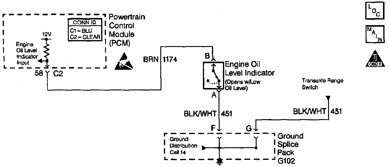 ^ Engine Oil Level Switch circuit: If the problem with the Low Oil Level lamp can not be isolated using the Engine Oil Level Switch Diagnostic table, use the PCM Controlled Lamps Diagnostic table.