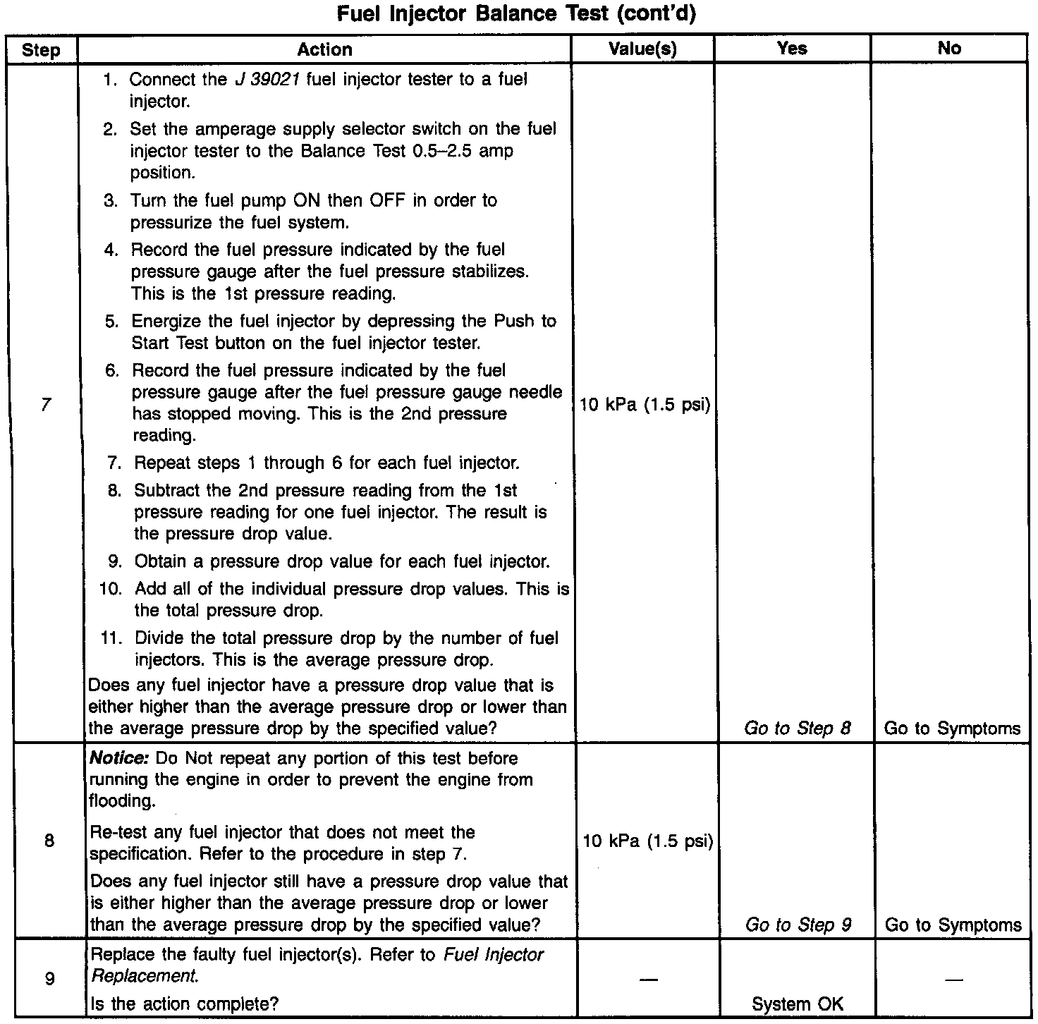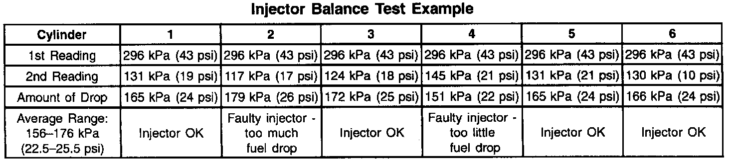 7. If the pressure drop value for each fuel injector is within 10 kPa (1.5 psi) of the average pressure drop value, the fuel injectors are flowing properly. Calculate the pressure drop value for each fuel injector by subtracting the second pressure reading from the first pressure reading. Refer to the Injector Balance Test Example.