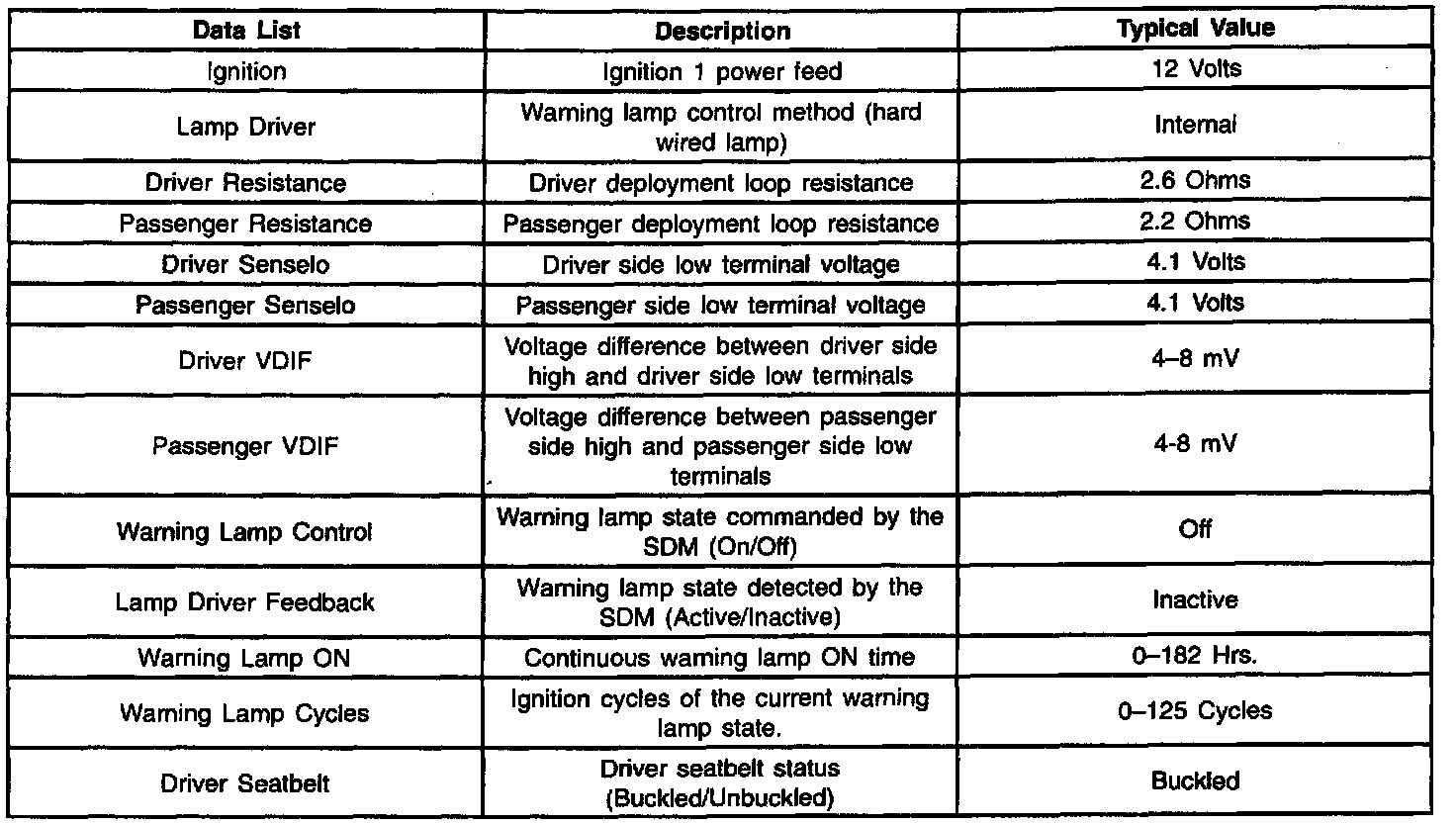 Make sure the scan tool contains updated software before attempting to communicate with the SIR system. To use the scan tool, connect it to the Data Link Connector (DLC) and turn the ignition switch to the ON position. The scan tool reads serial data sent from the inflatable restraint Sensing and Diagnostic Module (SDM) serial data output terminal 5 to the DLC terminal 9. The following table shows the typical values of the data displays under the following conditions: