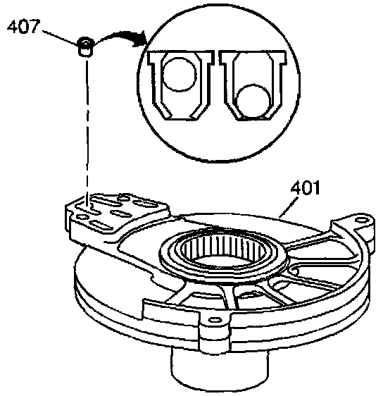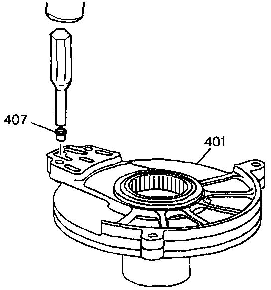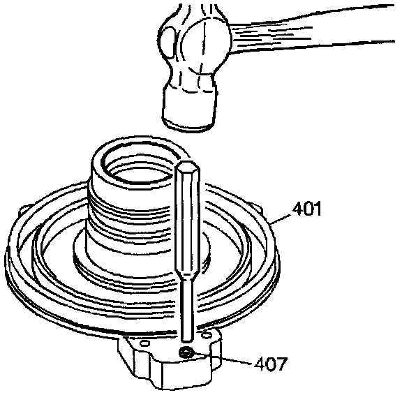 14. Using a 6.25 mm (1/4 inch) drift and a mallet, remove the valve assembly (407) from the driven sprocket support (401).