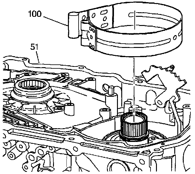 1. Assemble a new Intermediate/Fourth band (100) into the transmission case (51).