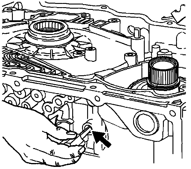 2. In order to verify the proper positioning of the band, insert a screwdriver through the Intermediate/Fourth servo bore. The screwdriver should press on the servo pin rest and compress the band around the reverse clutch housing.