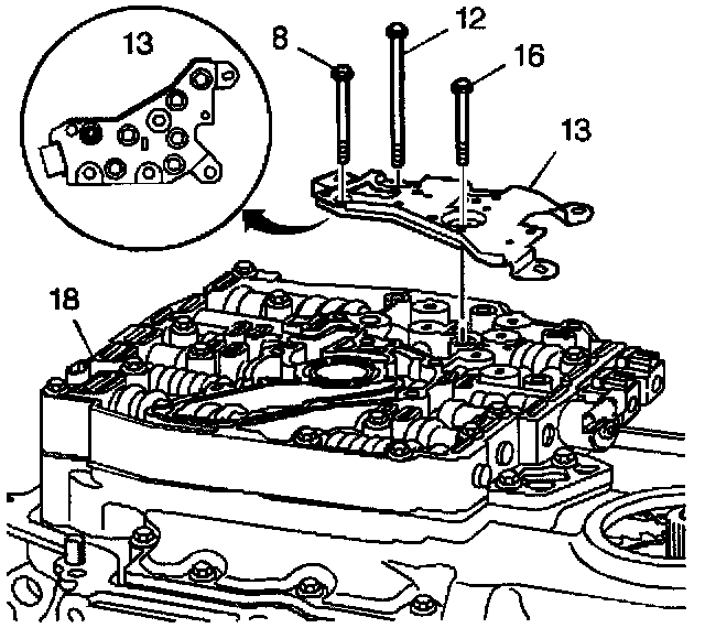 2. Remove the TFP switch assembly (13) from the control valve body assembly (18). The seven pressure switch O-rings are reusable and should remain with the pressure switch assembly.