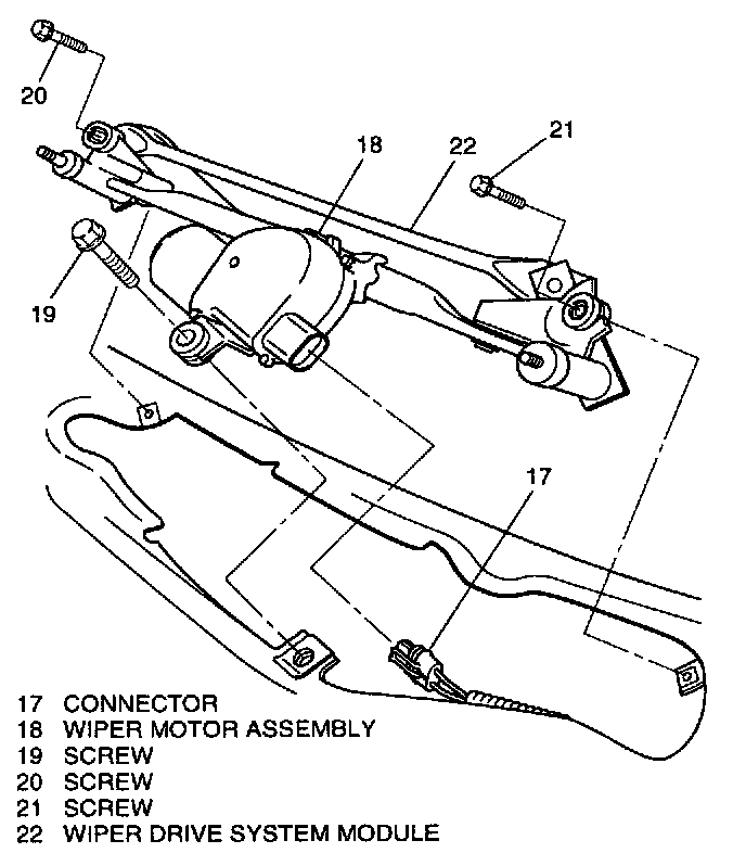 4. Three screws (19, 20, and 21) and wiper drive system module (22) from vehicle.