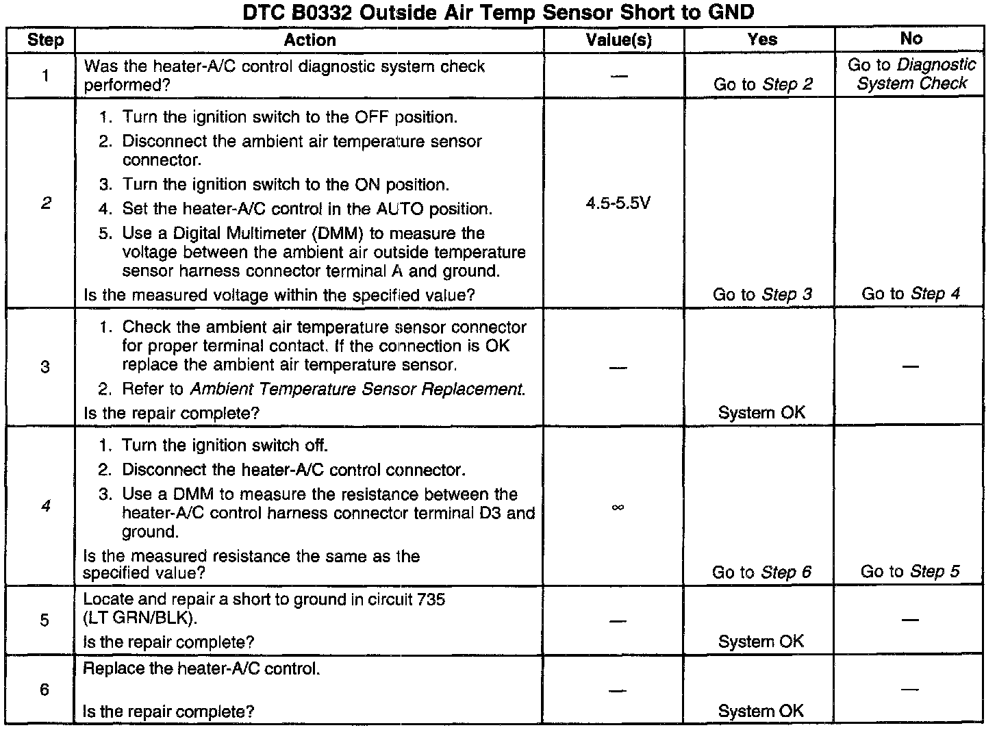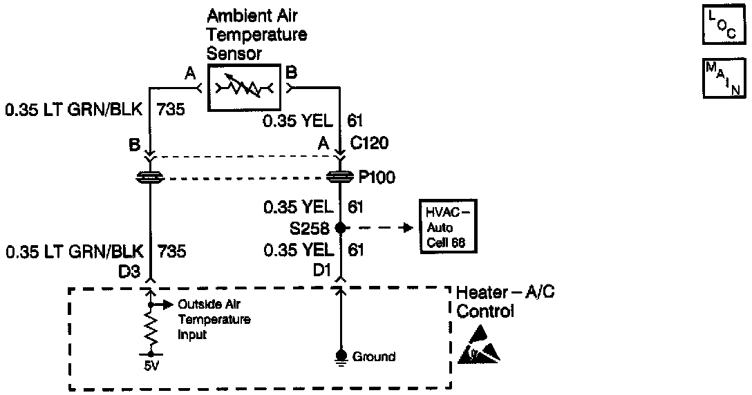 The heater-A/C control performs a check on the operation of the ambient air temperature sensor and detects a short to ground in circuit 735 (LT GRN/BLK).