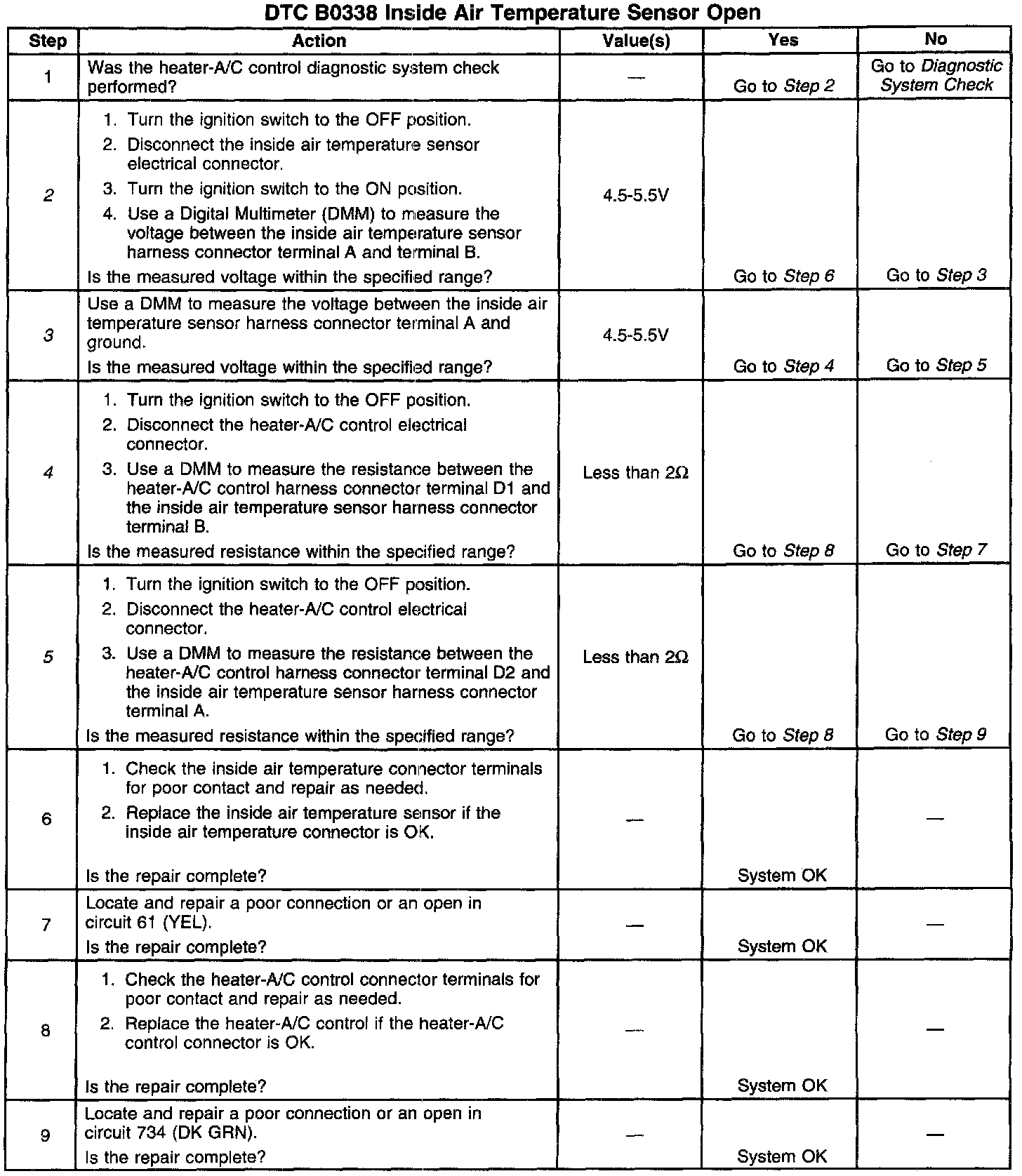 The heater-A/C control performs a check on the operation of the inside air temperature sensor and detects an open in circuit 734 (DK GRN).