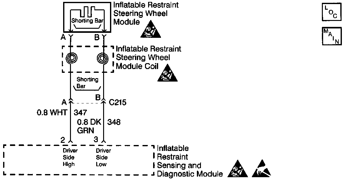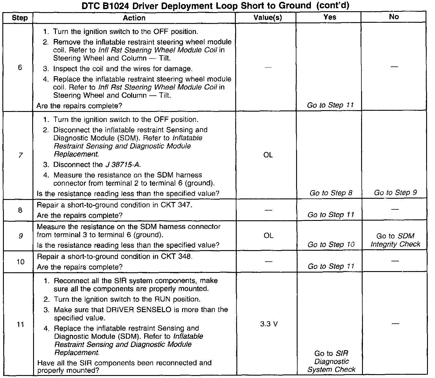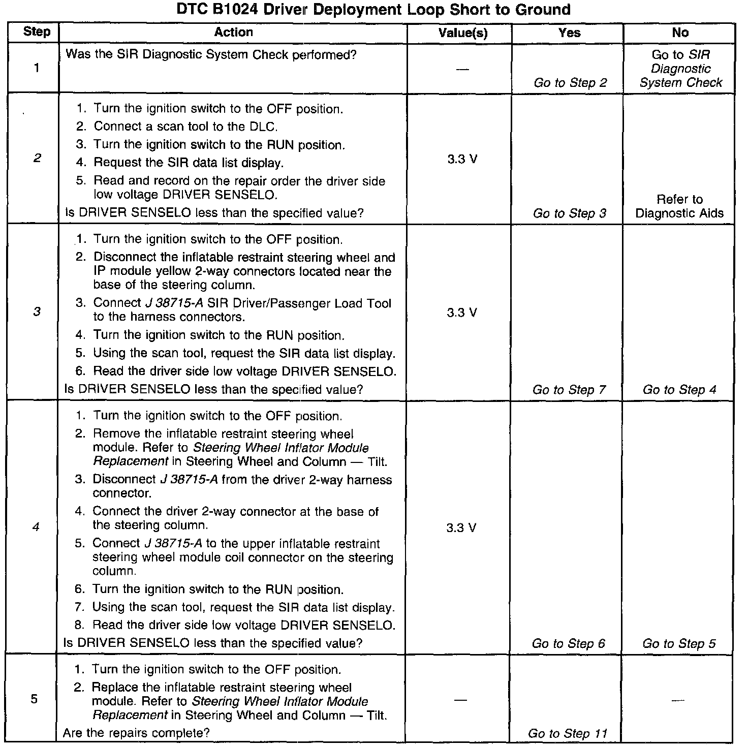 A short-to-ground in the inflatable restraint steering wheel module circuit can cause an intermittent condition. A DTC B1024 would be accompanied by DTC B1071. Inspect CKT 347 and CKT 348 carefully for cutting or chafing. A careful inspection of the circuits and components indicated on the DTC B1024 table is essential in order to prevent damage to the replacement inflatable restraint Sensing and Diagnostic Module (SDM). The diagnostic table directs the technician to note the entry value of DRIVER SENSELO. Comparing the value of DRIVER SENSELO can be helpful in determining if an intermittent condition exists.
