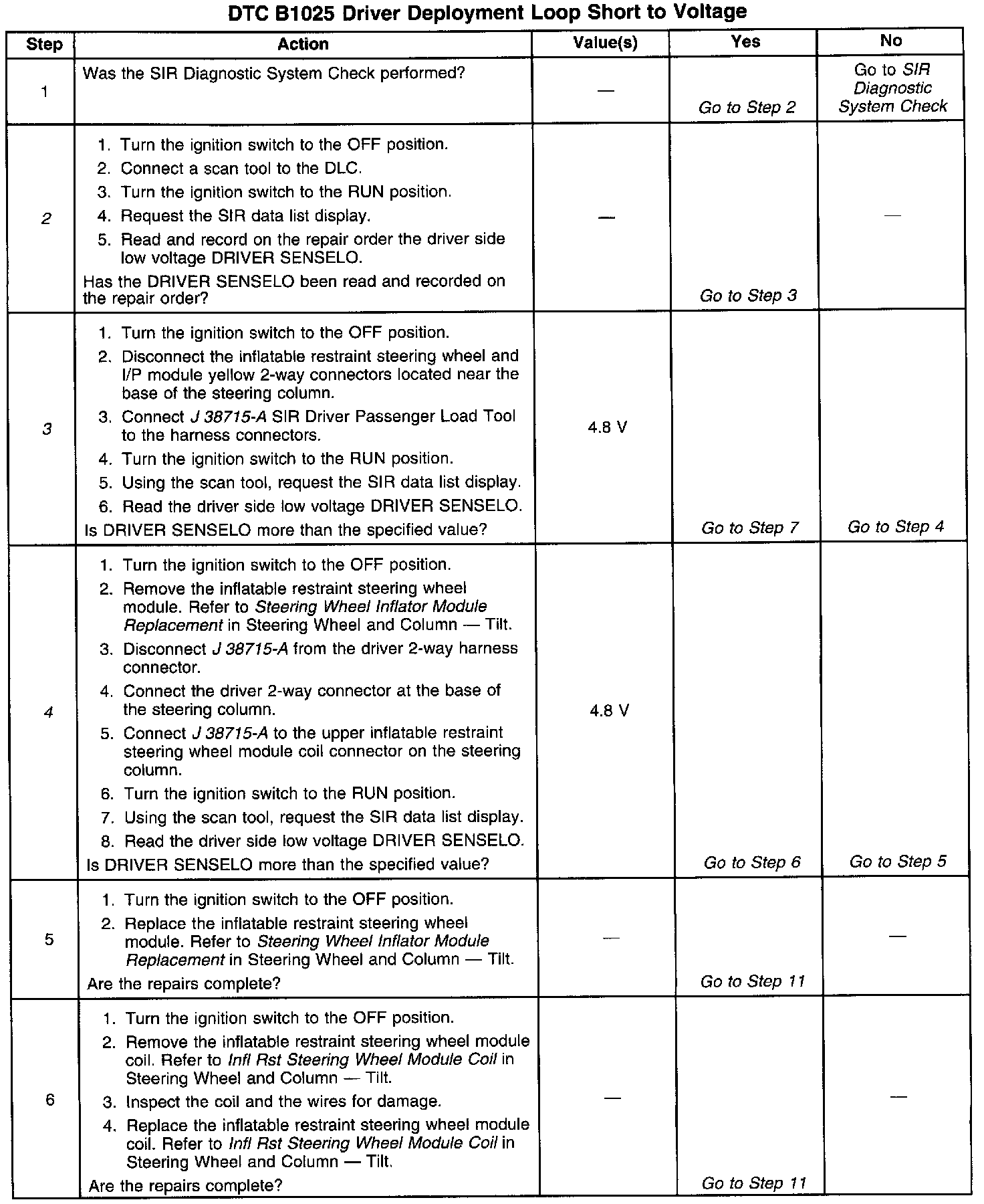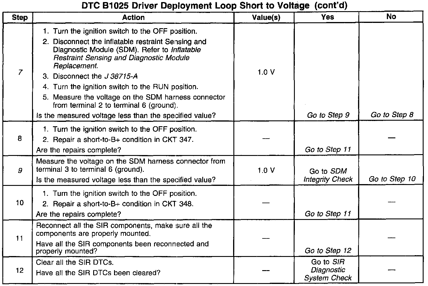 A short-to-B+ in the inflatable restraint steering wheel module circuit can cause an intermittent condition. Inspect CKT 347 and CKT 348 carefully for cutting or chafing. The diagnostic table directs the technician to note the entry value of DRIVER SENSELO. Comparing the value of DRIVER SENSELO can be helpful in determining it an intermittent condition exists.