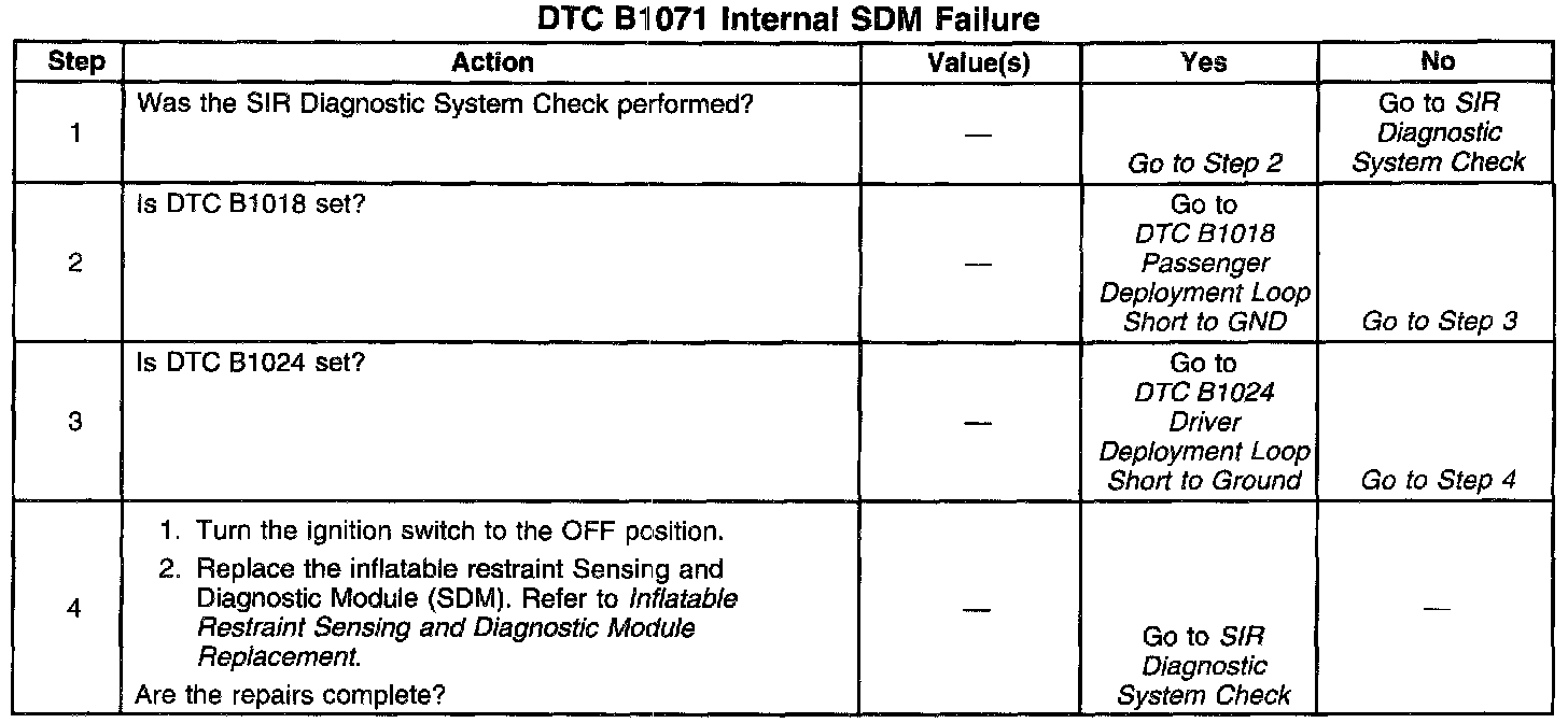 DTC B1071 is an indication of a potential internal inflatable restraint Sensing and Diagnostic Module (SDM) malfunction. DTC B1071 will set upon detection of any condition in the table below.
