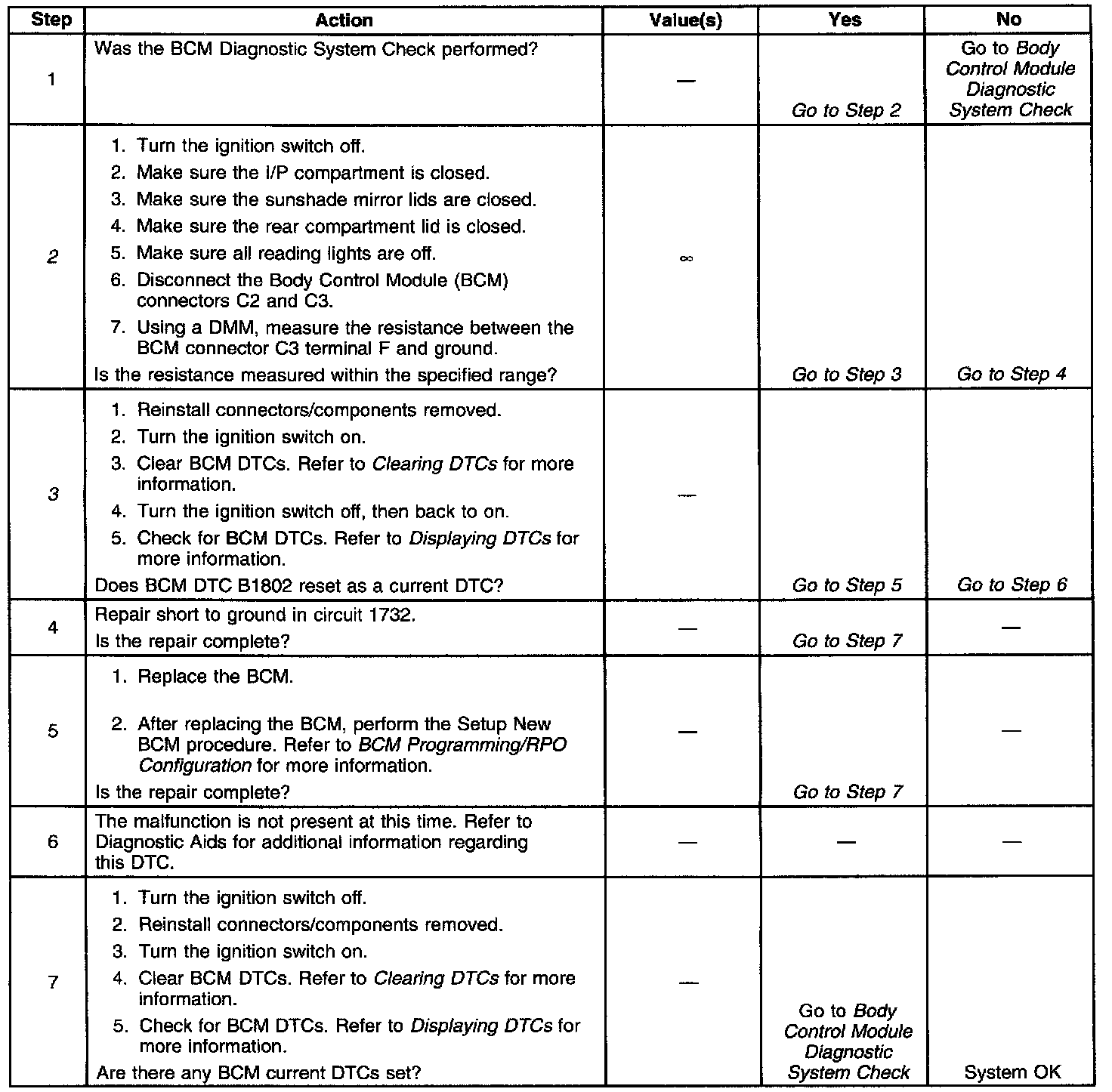 ^ The BCM no longer detects a short to ground in circuit 1732 when the ignition switch is on.