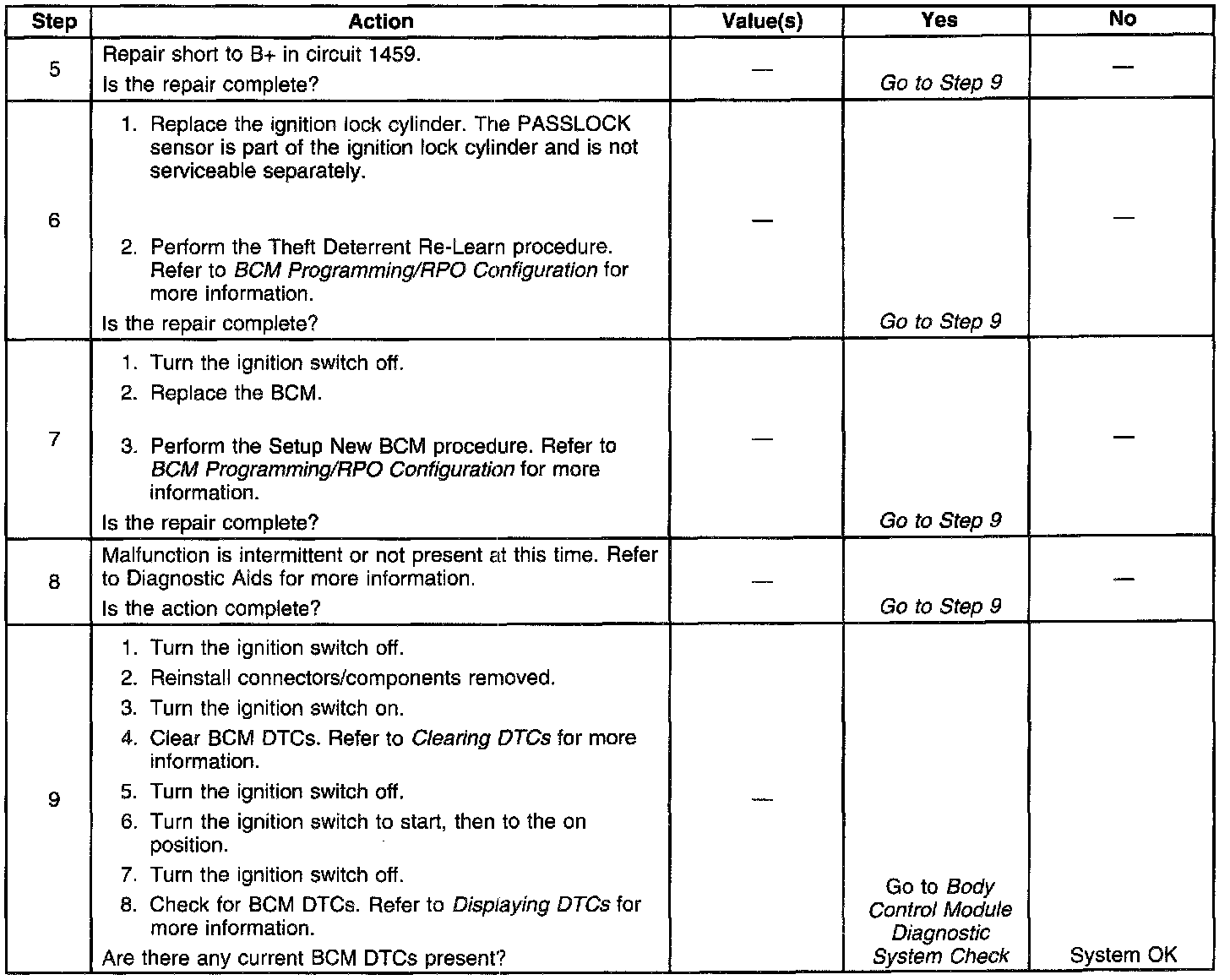 ^ Even when a short to B+ is present in circuit 1459, turning the ignition switch from off to accessory will clear this DTC as a current DTC. This DTC will reset as a current DTC when the ignition switch is off with the BCM in the wake-up state.