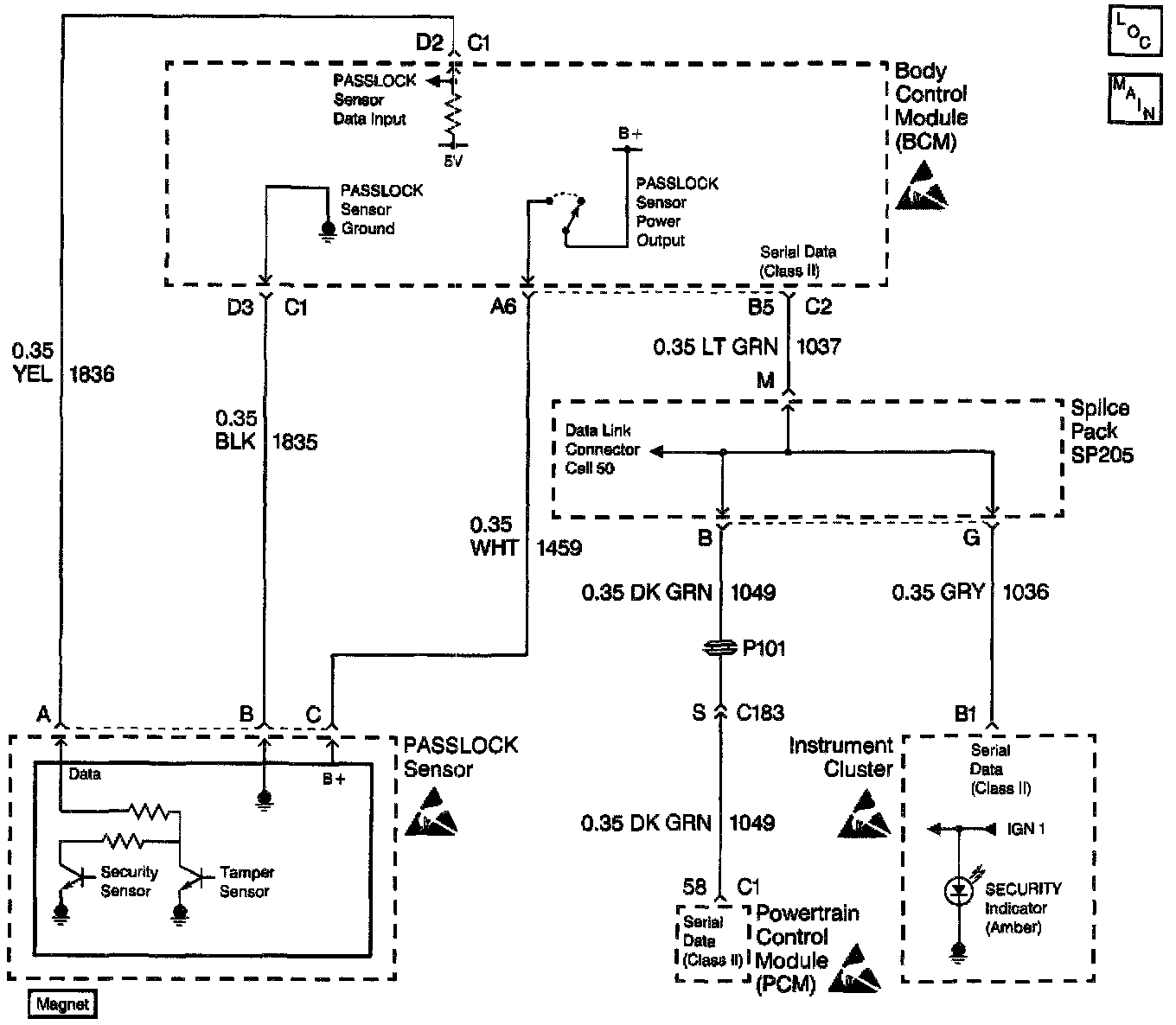 The Passlock theft deterrent system contains a Passlock sensor. The Passlock sensor is part of the ignition lock cylinder assembly. The BCM provides voltage (B+) to the Passlock sensor through circuit 1459 when the ignition switch is in the accessory, on, or start. The BCM also provides ground to the Passlock sensor through circuit 1835. The Passlock sensor interfaces with the SCM through the Passlock detection circuit 1836. When turning the ignition switch to the start position with the proper key, the Passlock sensor generates an analog voltage signal. This signal is sent through the Passlock detecting circuit. This analog voltage signal is of a specific value to the vehicle, and vanes from vehicle to vehicle. When attempting to start the engine, the BCM compares a preset stored analog voltage value with the signal coming from the sensor. Because both values match, the BCM sends a fuel enable password via the Class II serial data link to the PCM. As a result, the PCM enables the crank relay, and allows fuel delivery to the engine.
