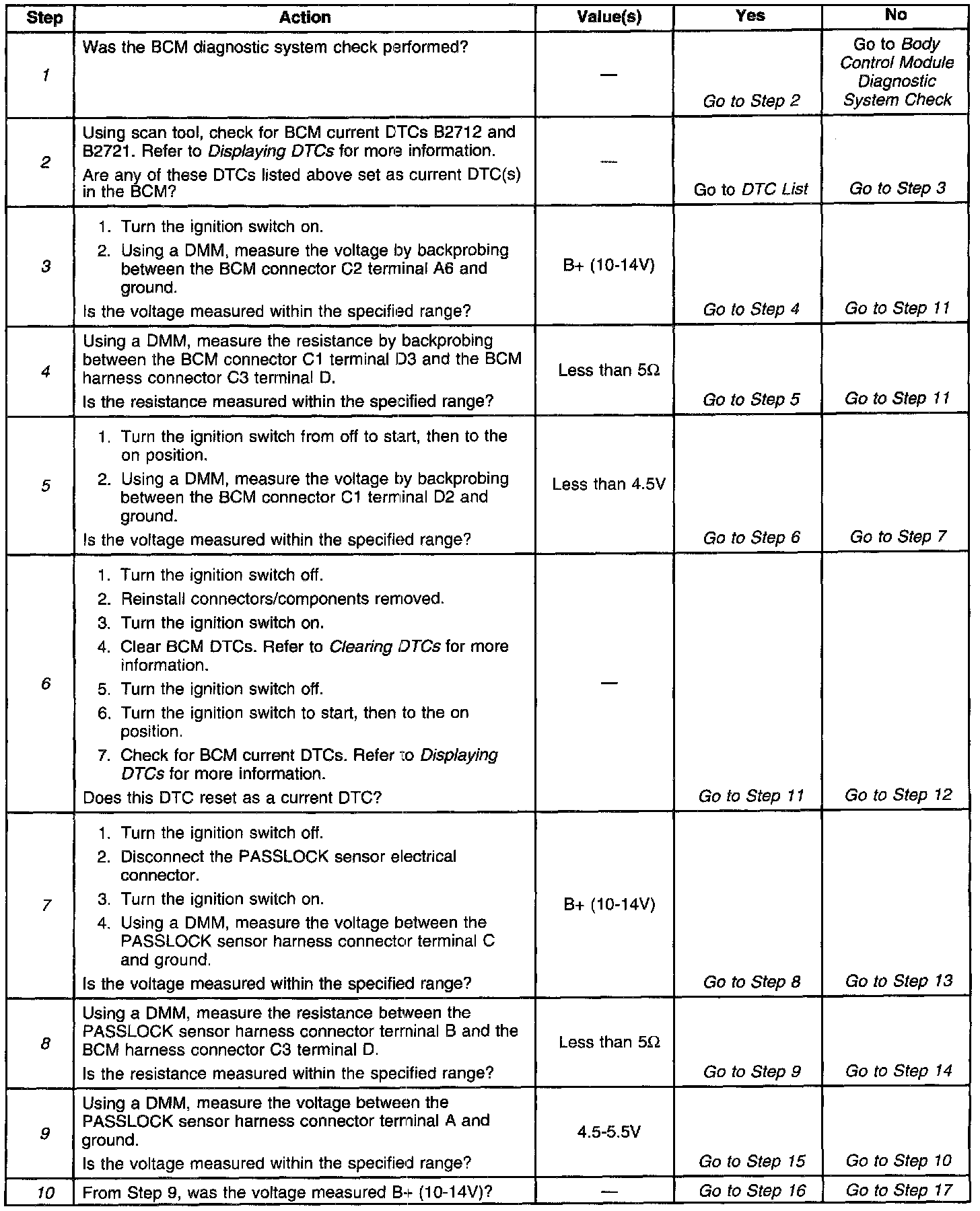 ^ Check for poor connections at both the BCM and the ignition lock cylinder assembly, these could cause an open, incorrect Passlock sensor voltage signal, or intermittent malfunction. If the DTC is a history DTC, the problem may be intermittent. Try performing the tests shown while moving wiring, connectors, and the ignition key, this can often cause the malfunction to appear.