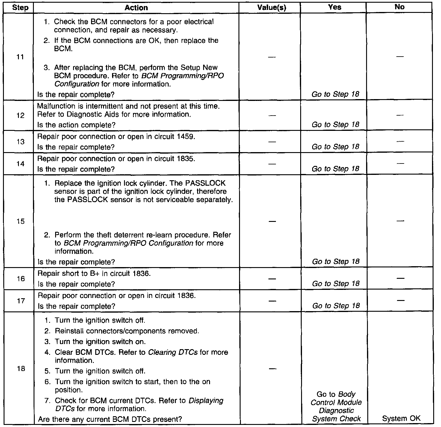 ^ Perform the diagnostic table for this DTC when the vehicle experiences an engine no crank condition, with the SECURITY indicator ON steadily (after bulb check), and no BCM DTCs stored. This condition may be related due to an open or short to B+ in circuit 1836. The BCM monitors for an open or short to B+ in circuit 1836 causing to set this DTC only AFTER the BCM sampled a valid analog voltage signal from the Passlock sensor.