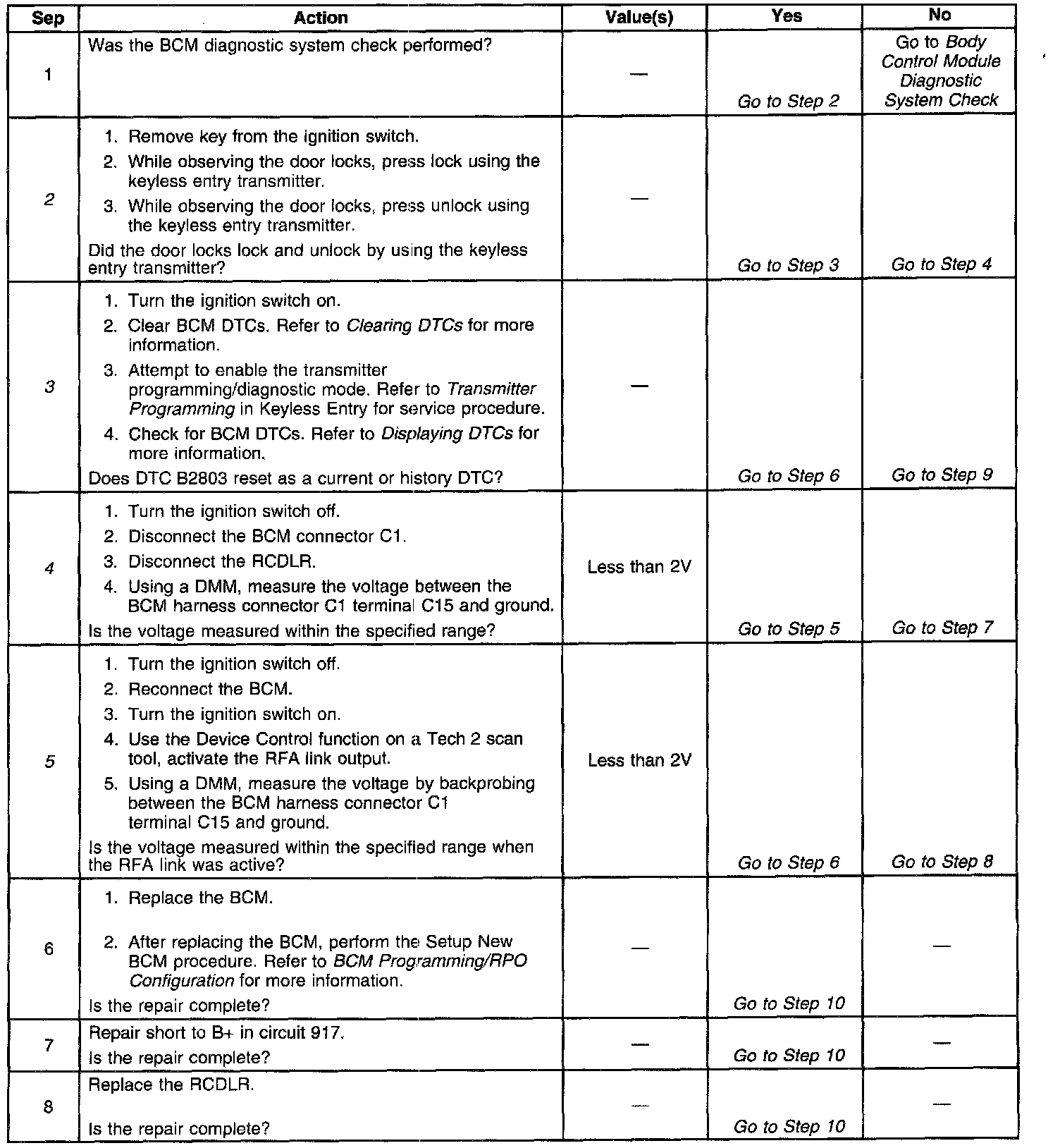 ^ The BCM checks for DTC B2803 only when attempting to enable transmitter programming/diagnostic mode. Refer to Transmitter Programming in Keyless Entry for more information on how to enter this mode.