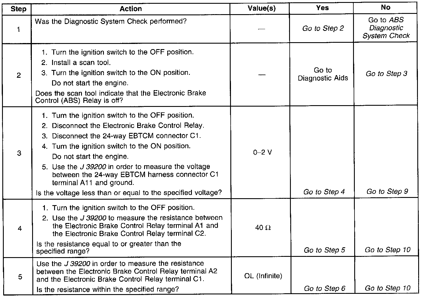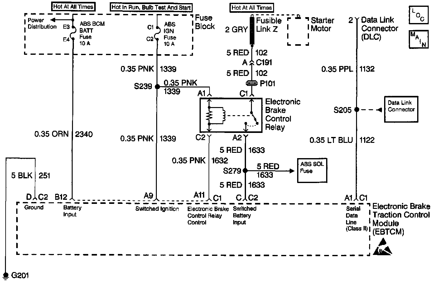 Ignition voltage is supplied through terminal A1 of the Electronic Brake Control Relay. The above enables the Electronic Brake Traction Control Module (EBTCM) to energize the pulling coil by completing the ground circuit at connector C1 terminal All of the EBTCM. The magnetic field created closes the Electronic Brake Control Relay contacts. The magnetic field also allows battery voltage and current through the Electronic Brake Control Relay terminal C1 to be supplied to the EBTCM through connector C2 terminal C and to the brake solenoid valves through S279.