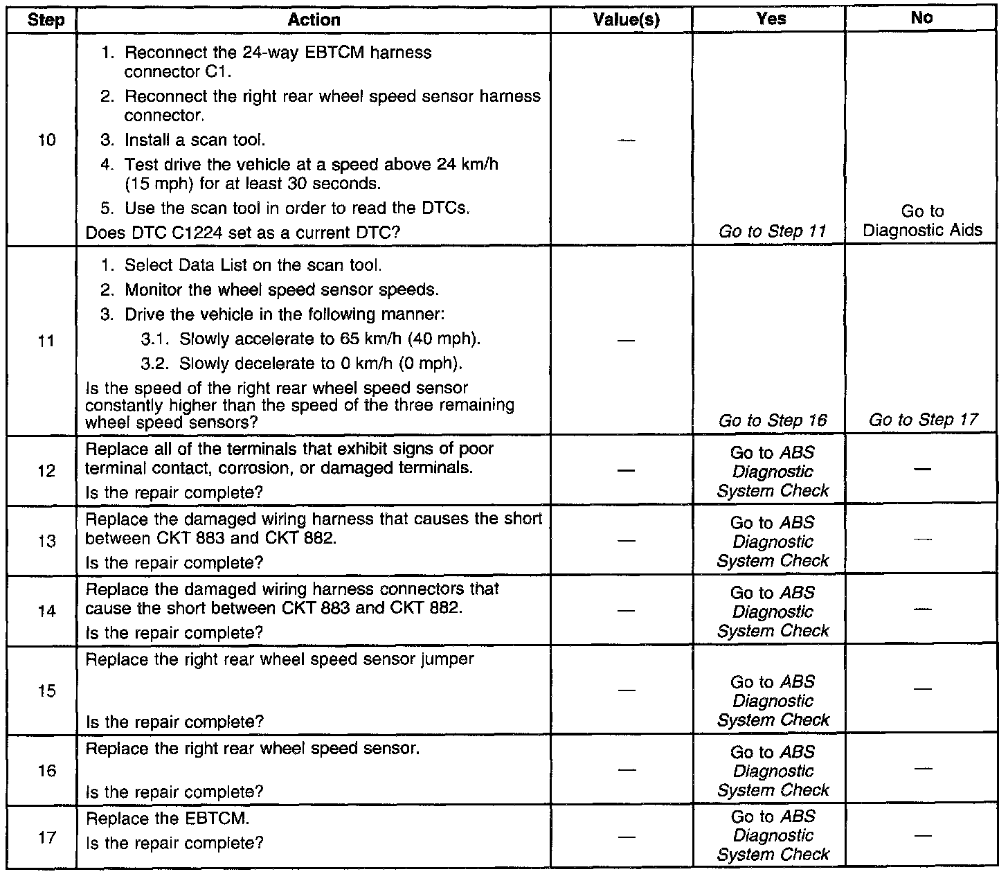 Do not disturb any of the electrical connections. Change electrical connections only when instructed to do so by a step in the diagnostic table. Changing electrical connections at the correct time will ensure that an intermittent electrical connection will not be corrected until the source of the malfunction is found. Use the following procedure in order to replace a wheel speed sensor: