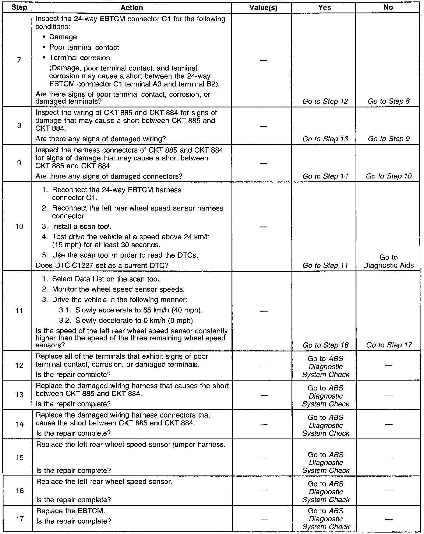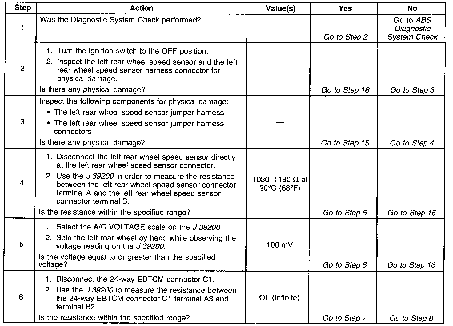 - Physical damage to the wiring harness Difficulty may occur when trying to locate intermittent malfunctions in the wheel speed sensor. Do not disturb any of the electrical connections. Change the electrical connections only when instructed to do so by a step in the diagnostic table. Changing the electrical connections at the correct time will ensure that an intermittent electrical connection will not be corrected until the source of the malfunction is found.