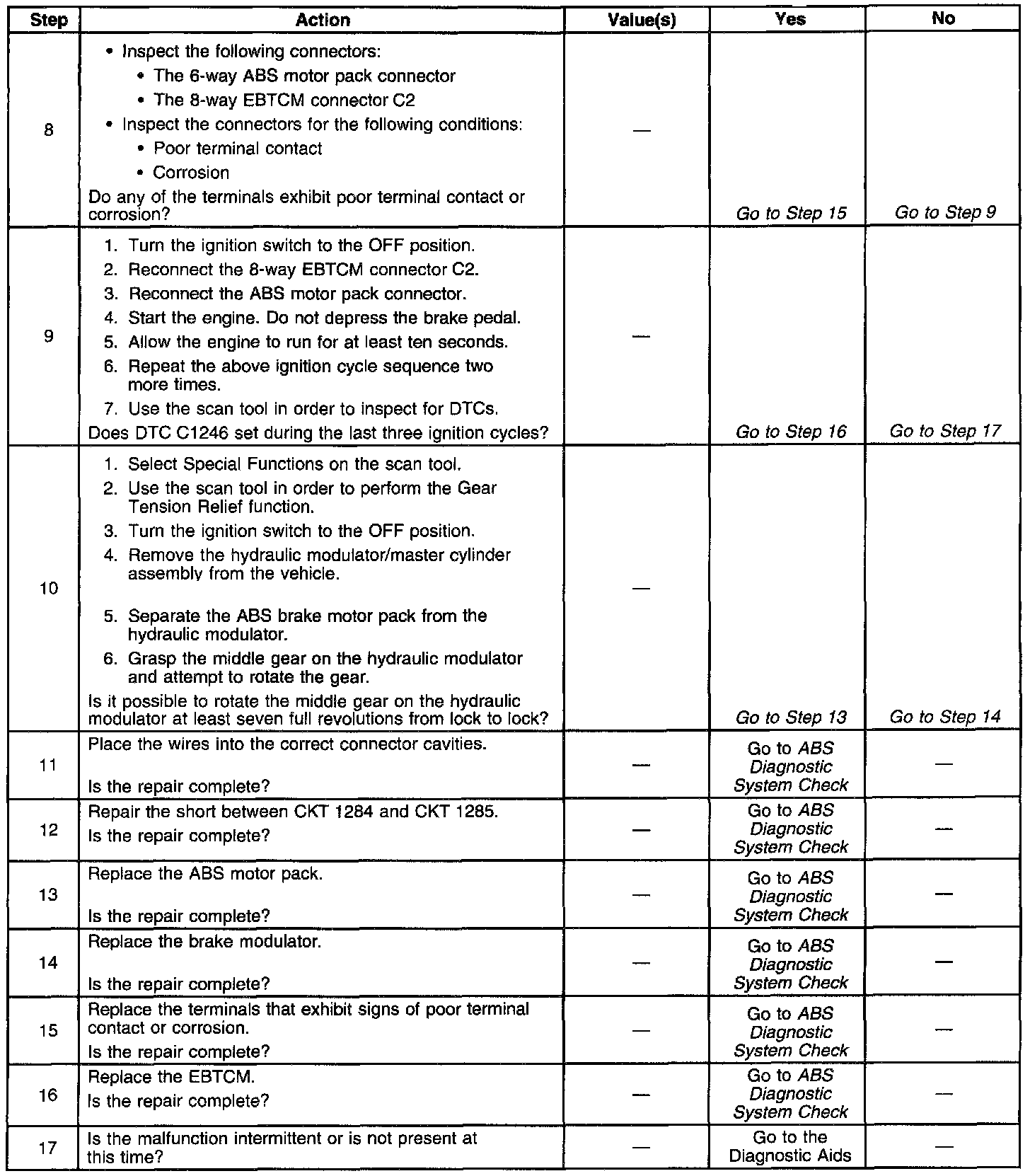- 5 km (3 mph) when the brake is on DTC C1246 can set during ABS stops A malfunction exists if the Electronic Brake Traction Control Module (EBTCM) detects a condition in which the EBTCM cannot move the ABS motor in either direction.