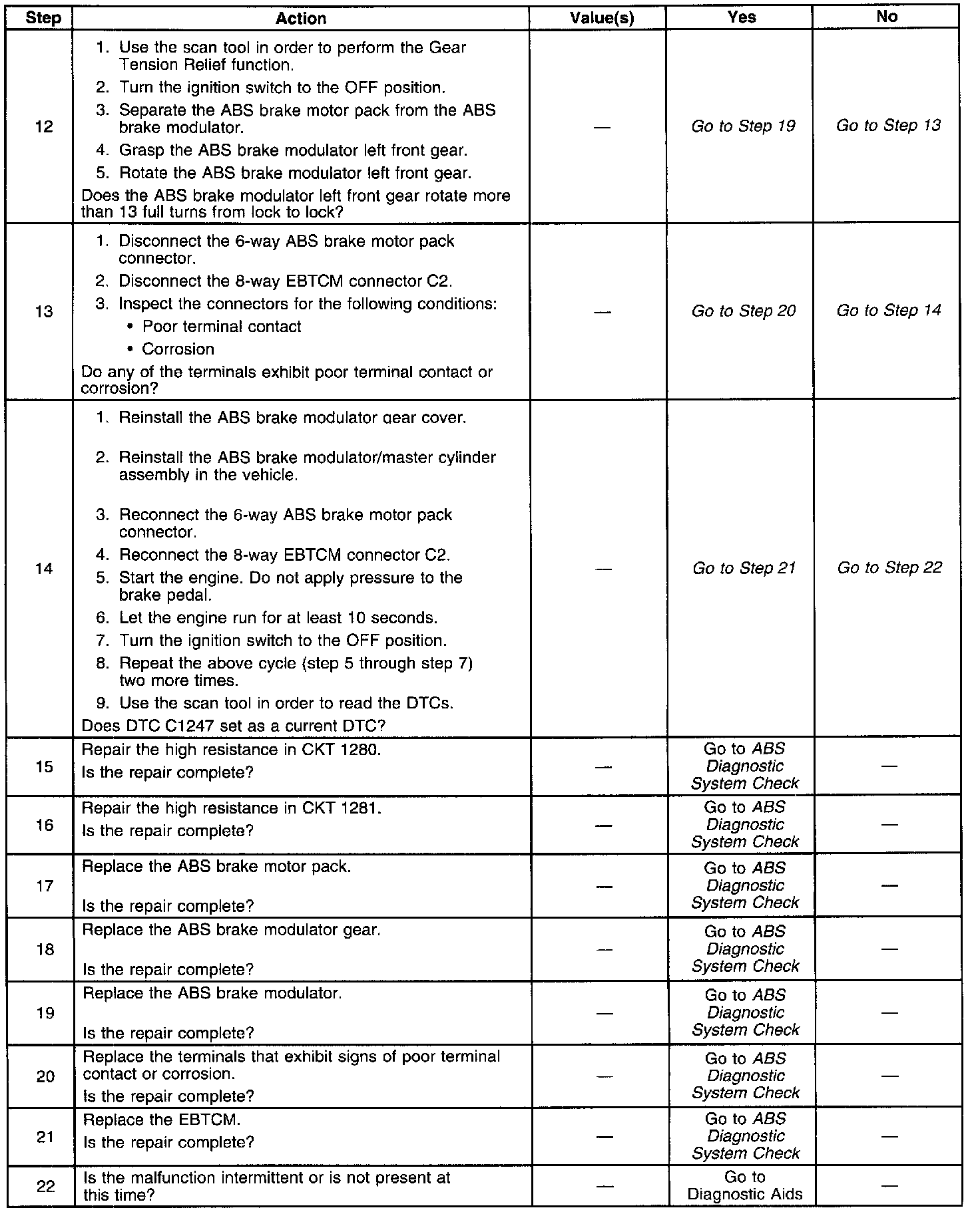 Use the enhanced diagnostic function of the Scan Tool in order to measure the frequency of the malfunction. Refer to the Scan Tool manual or Scan Tool Diagnosis for the procedure. DTC C1247 may set after modulator disassembly if the modulator pistons are positioned at the bottom of the modulator piston bore. If DTC C1247 only occurs once and DTC C1256 also occurs,