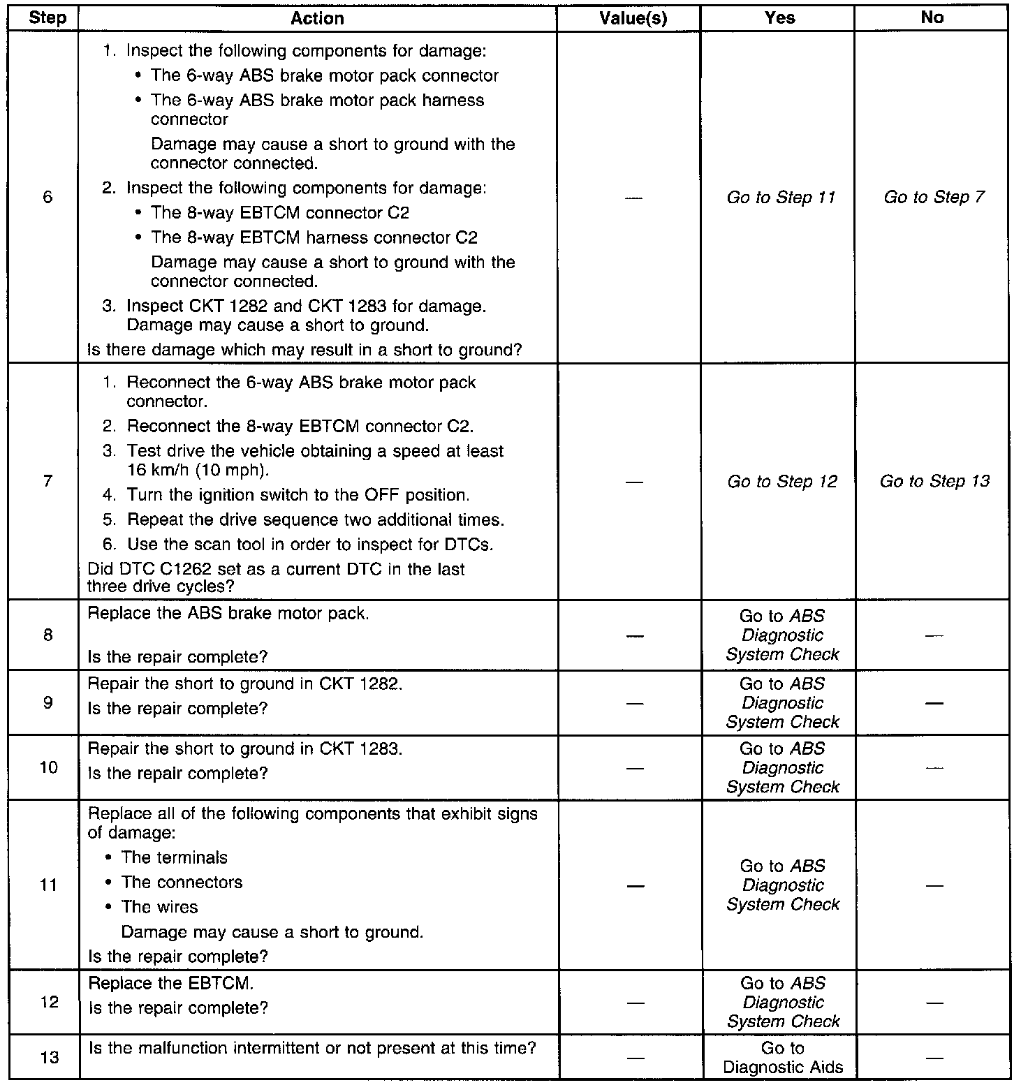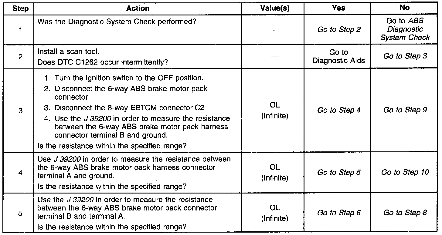 DTC 1262 identifies an ABS motor circuit that shorts to ground. The malfunction will cause one of the following conditions to occur: