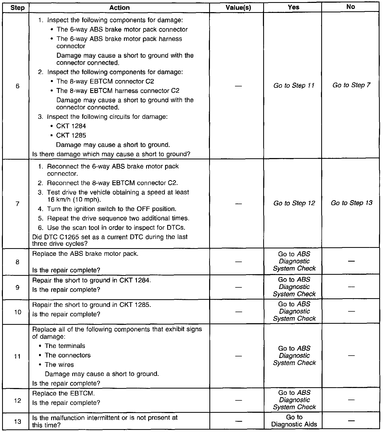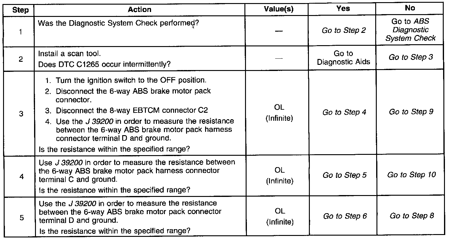 DTC 1265 identifies an ABS motor circuit that shorts to ground. The malfunction will cause one of the following conditions to occur: