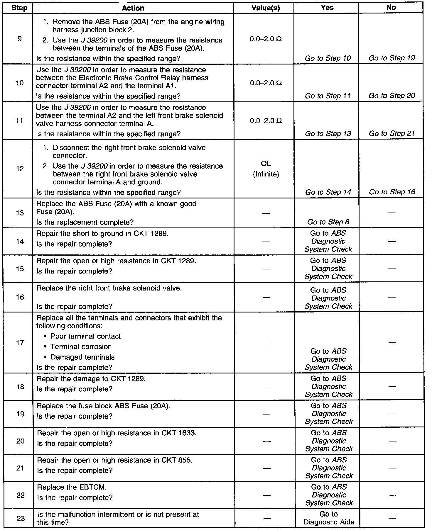 A malfunction exists if the Electronic Brake Traction Control Module (EBTCM) detects the right front brake solenoid valve control circuit voltage is not within specifications.