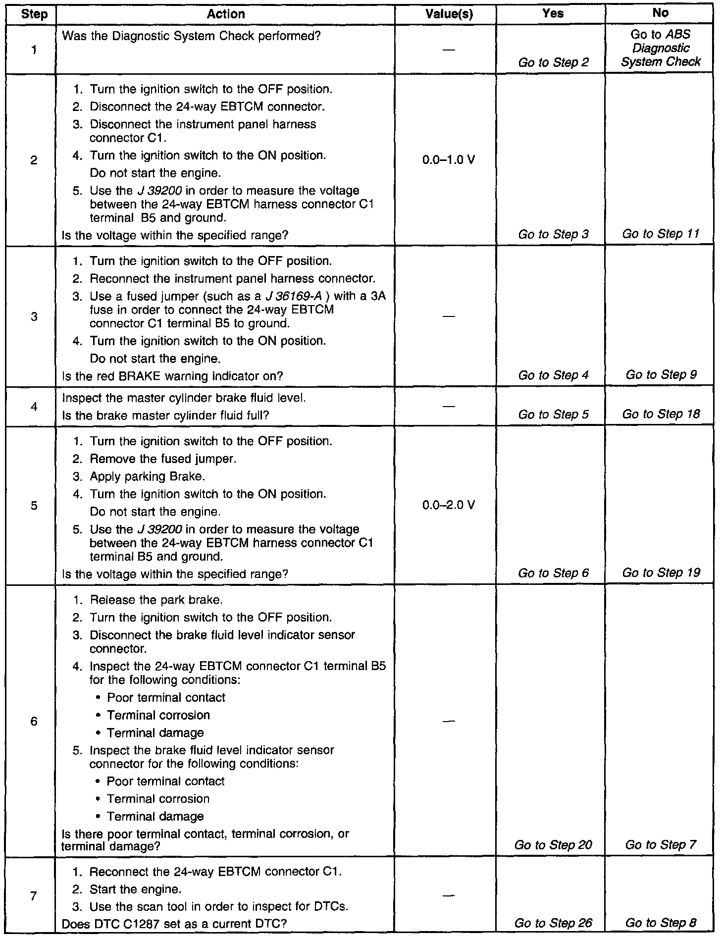 A malfunction exists if the red BRAKE warning indicator circuit voltage is out of specification. If the circuit voltage is out of specification, an open circuit or a short to voltage exists.