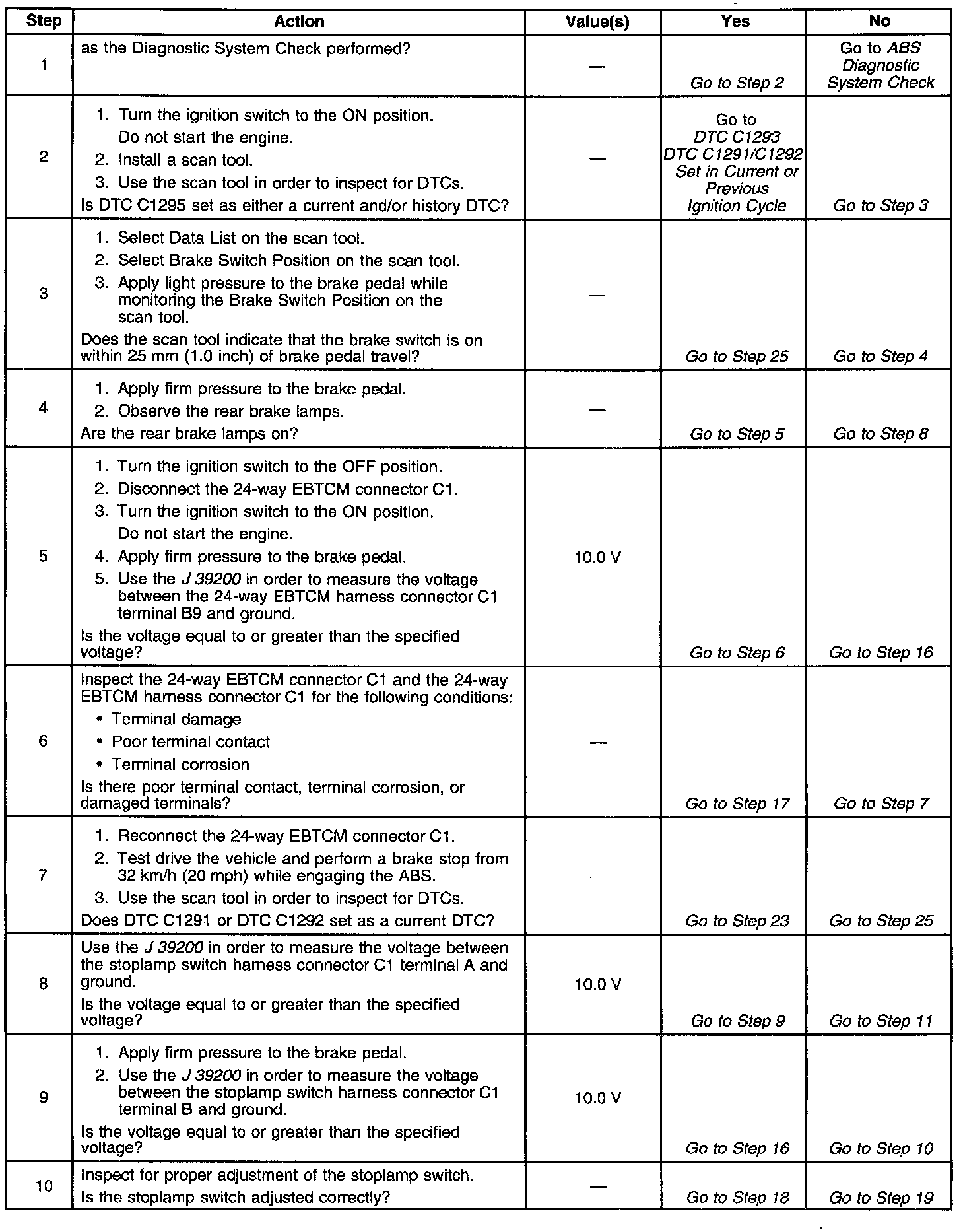 DTC C1292 determines the proper operation of the brake switch. Proper operation of the brake switch is important because the brake switch activates the ABS when the brake switch is on. If the brake switch is off, the ABS will never activate. This malfunction is only detected when ABS is required because it is difficult to detect the malfunction under normal braking conditions.