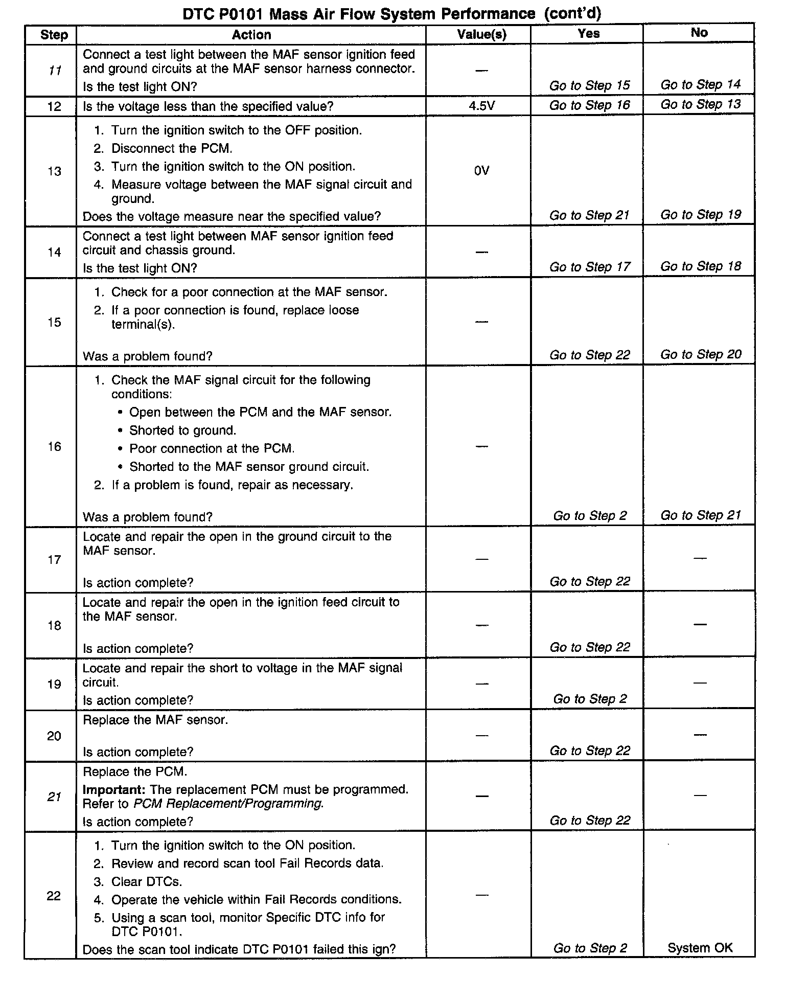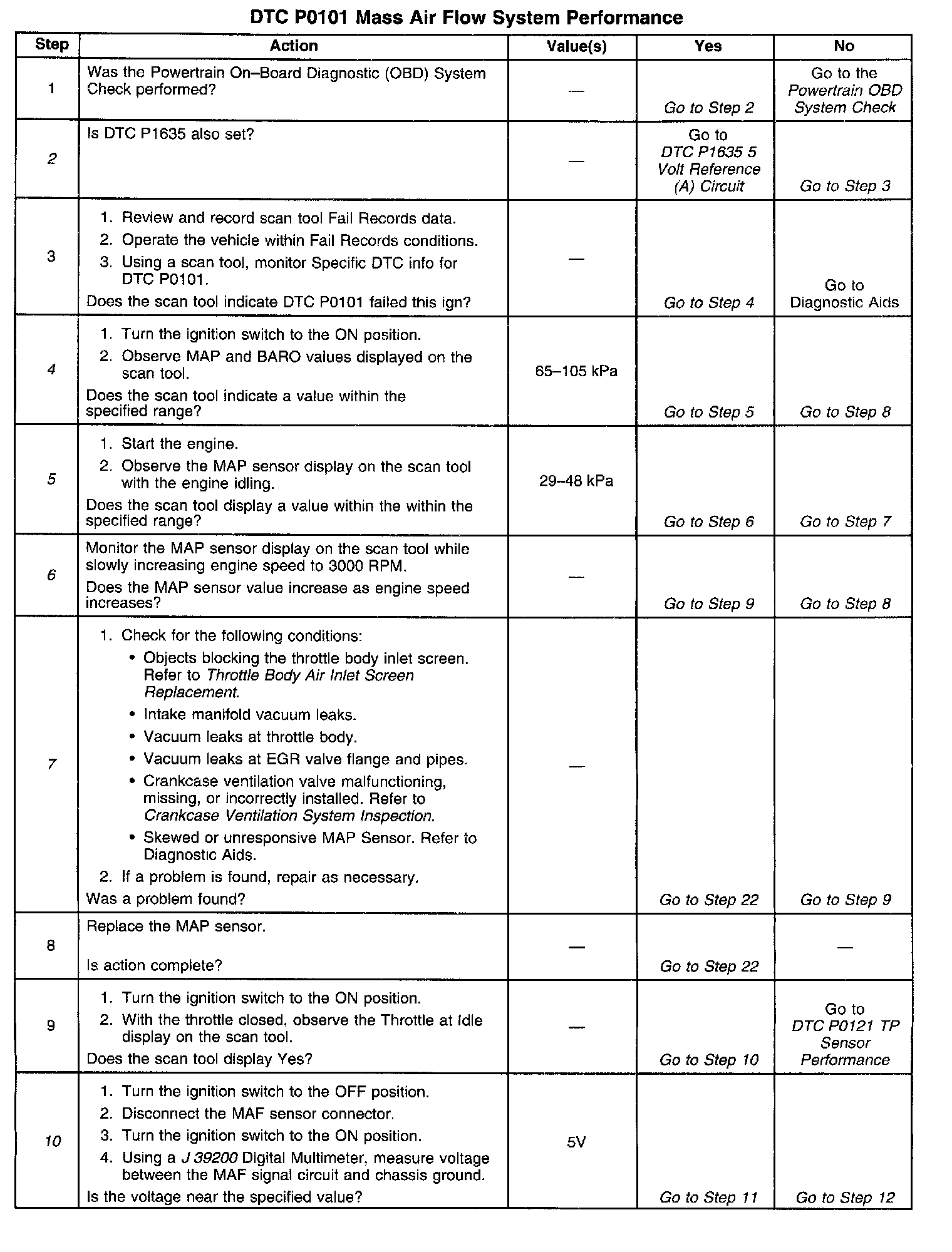 4. This step verifies a proper MAP/ BARO value at initial key ON. If the MAP sensor is stuck the barometric pressure value will be incorrectly calculated. This will cause the predicted Mass Air Flow calculations to be inaccurate. DTC P0101 will set if the MAF sensor signal does not match the predicted MAF value.