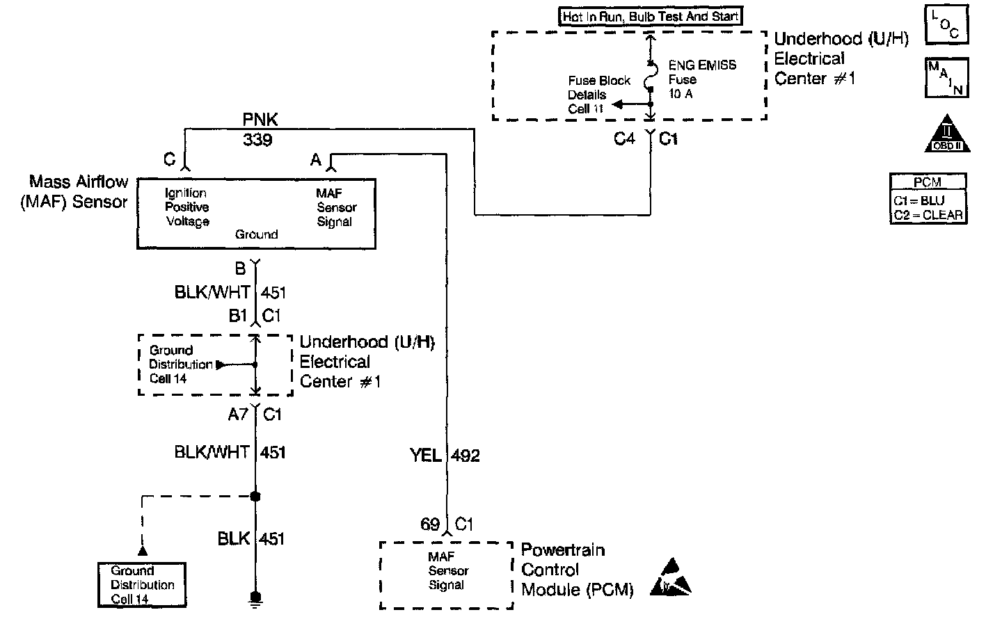 10. A voltage reading of less than 4 or over 6 volts at the MAF sensor signal circuit indicates a malfunction in the wiring or a poor connection.