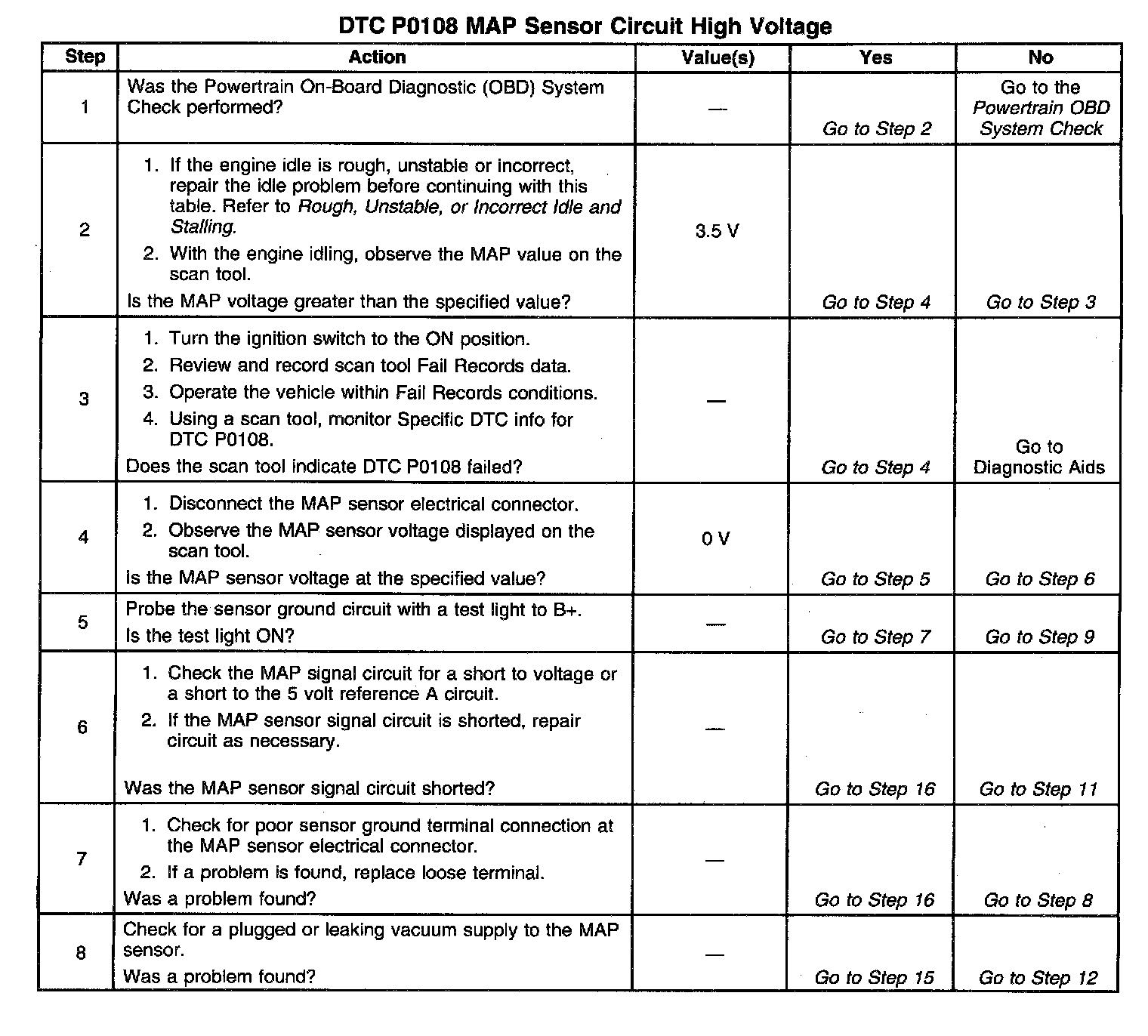 The Manifold Absolute Pressure (MAP) sensor responds to changes in the intake manifold pressure. The Powertrain Control Module (PCM) supplies a 5 volt reference and a ground for the MAP sensor. The MAP sensor provides a signal to the PCM relative to pressure changes in the manifold. The MAP sensor signal voltage to the PCM varies from below 2 volts at idle (low manifold absolute pressure high vacuum) to above 4 volts with the key ON, engine not running or at wide open throttle (high manifold absolute pressure - low vacuum). The PCM monitors the MAP signals for voltages outside the normal range of the MAP sensor. If the PCM detects a MAP signal voltage that is excessively high, DTC P0108 will be set.