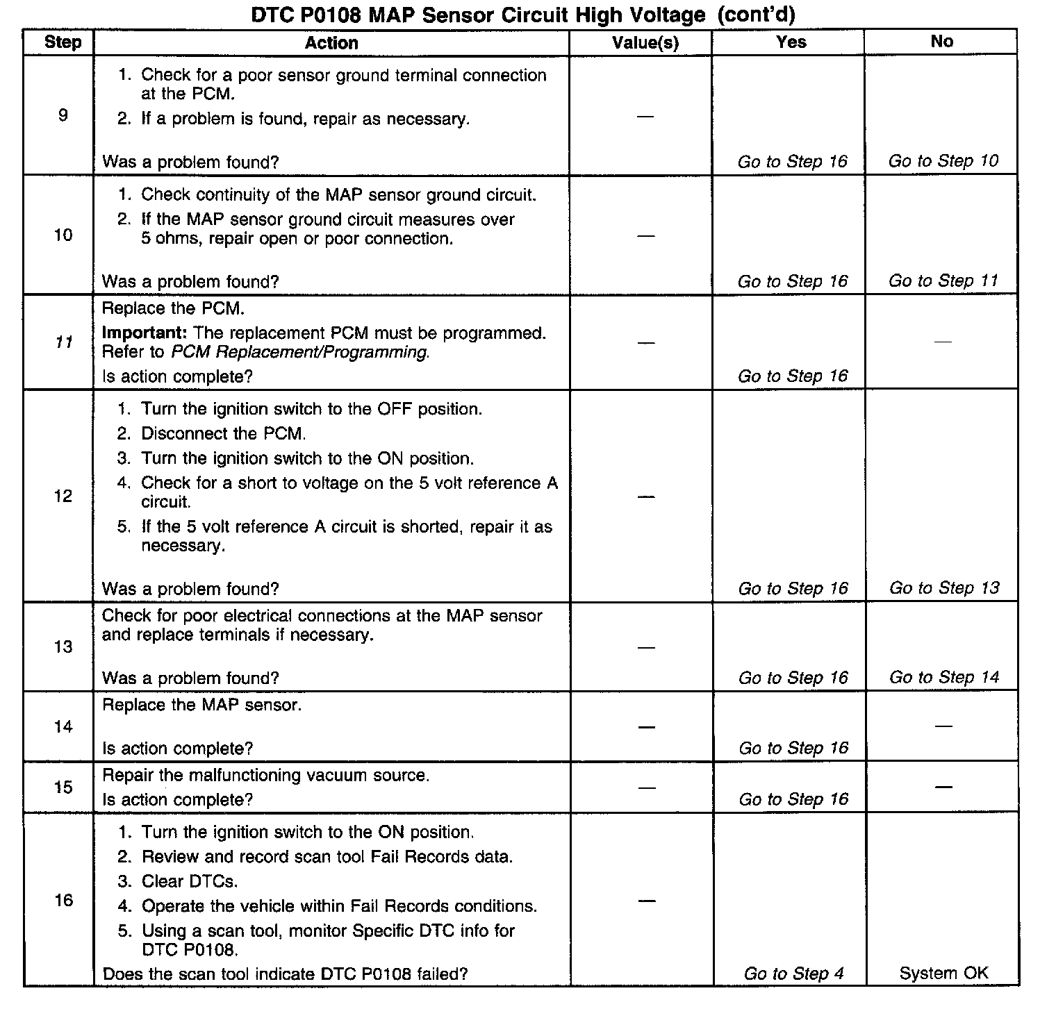 If DTC P0108 cannot be duplicated, the information included in the Fail Records data can be useful in determining since the DTC was last set. If it is determined that the DTC occurs intermittently, performing the DTC P1108 Diagnostic Chart may isolate the cause of the malfunction.