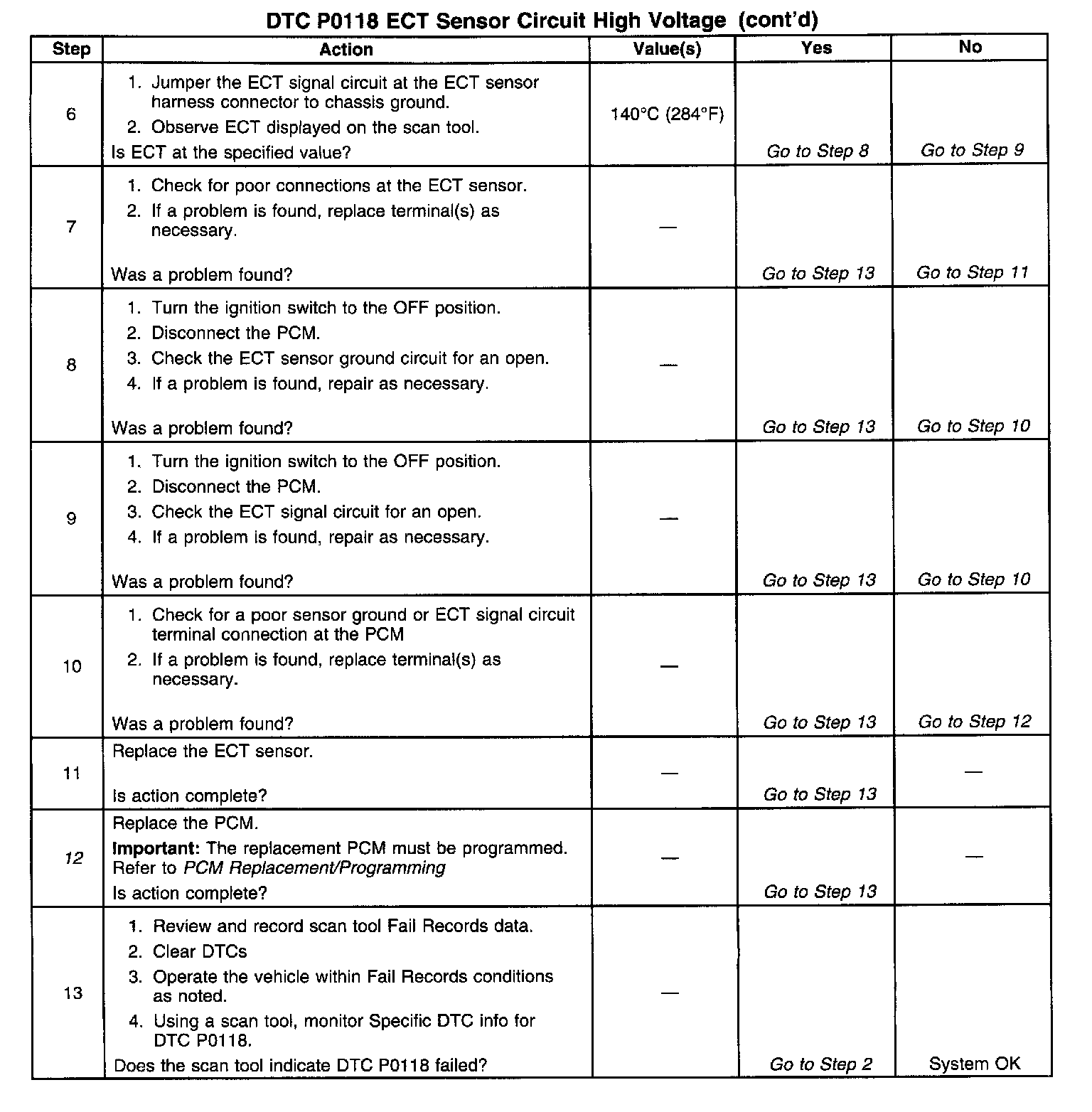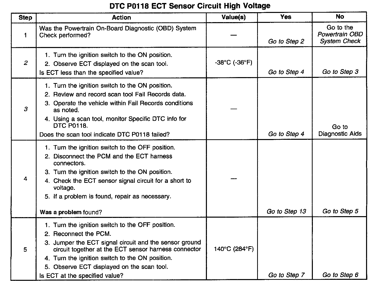 3. If DTC P0118 can be repeated only by duplicating the Fail Records conditions, refer to the Temperature vs Resistance Table. Coolant Temperature Sensor/Switch (For Computer)