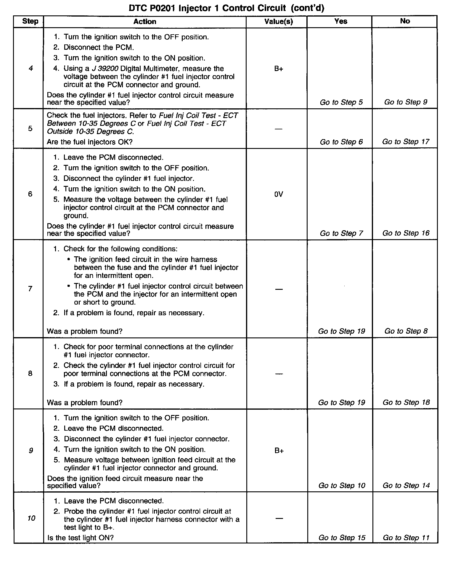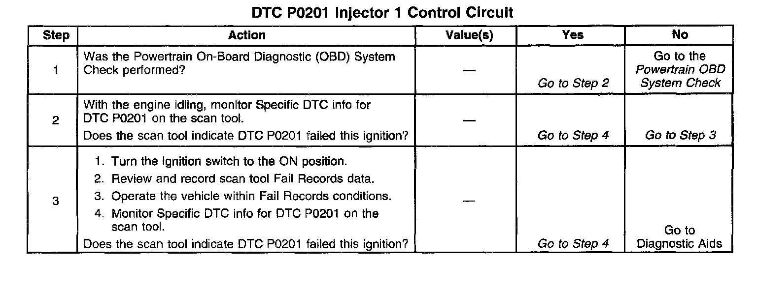 The Powertrain Control Module (PCM) controls each fuel injector separately through a ground driver circuit located within the PCM. The PCM monitors the driver circuit and has the ability to detect an electrical malfunction. If the PCM detect an electrical malfunction in the fuel injector circuit for cylinder #1, DTC P0201 will set.