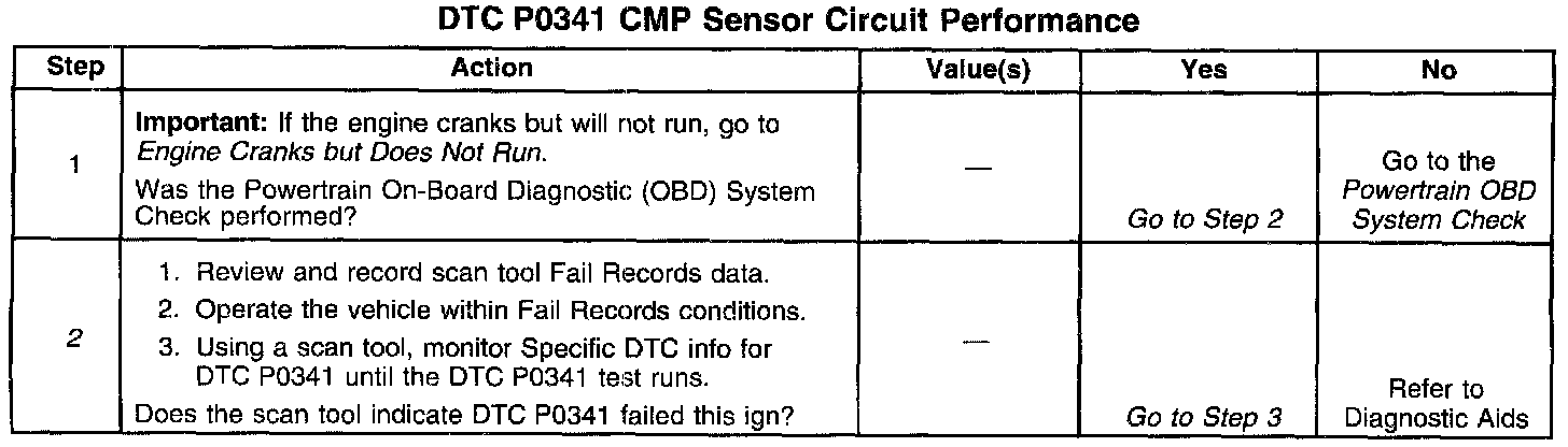 The camshaft position Powertrain Control Module (PCM) input is produced by the ignition control module. The Ignition Control Module (ICM) produces the camshaft position PCM input by filtering the Camshaft Position (CMP) sensor pulses when the engine is running and CKP sync pulses are also being received. The PCM uses the camshaft position PCM input pulses to initiate sequential fuel injection and to determine crankshaft position for the misfire diagnostic. The PCM constantly monitors the number of pulses on the camshaft position PCM input circuit and compares the number of camshaft position PCM input pulses to the number of 18X reference pulses and the number of 3X reference pulses being received. If the PCM receives an incorrect number of pulses on the camshaft position PCM input circuit, DTC P0341 will set and the PCM will initiate injector sequence without the camshaft position PCM input with a one in six chance that injector sequence is correct. The engine will continue to start and run normally, although the misfire diagnostic will be disabled.