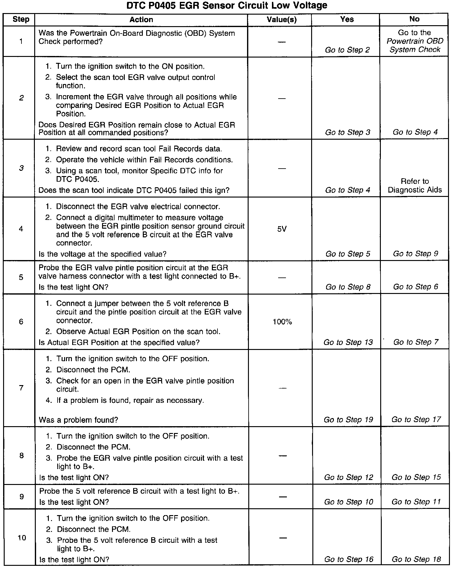 The Exhaust Gas Recirculation (EGR) Valve Pintle Position Sensor circuit provides EGR valve opening information to the Powertrain Control Module (PCM). The PCM supplies a 5 volt reference and a ground circuit for the EGR pintle position sensor. The EGR pintle position sensor varies the voltage relative to the amount of commanded EGR. The PCM monitors the EGR pintle position sensor input to ensure that the EGR valve responds properly to commands from the PCM and to detect a fault. If the PCM detects an excessively low EGR pintle position signal voltage, DTC P0405 will set.