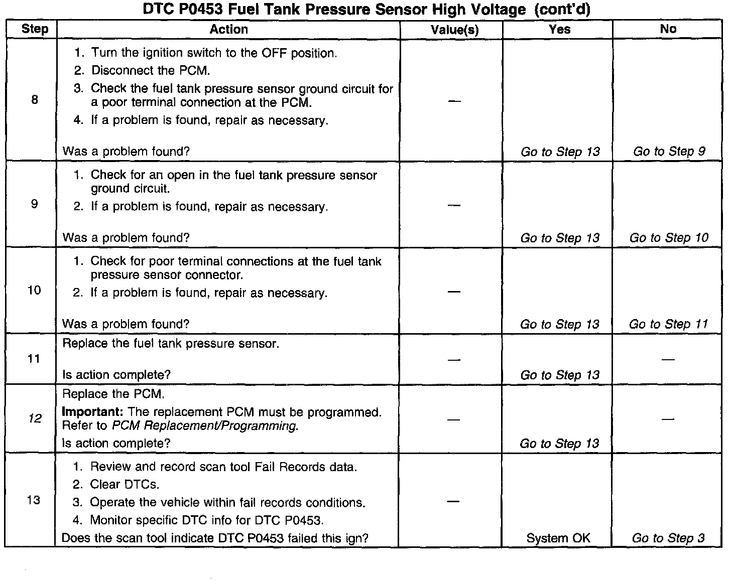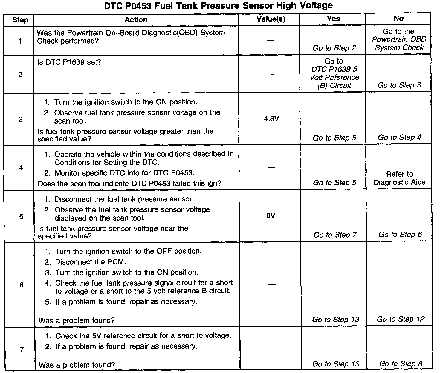 The Powertrain Control Module (PCM) monitors the fuel tank pressure sensor signal to detect vacuum decay and excess vacuum during the enhanced Evaporative Emissions (EVAP) diagnostic. The fuel tank pressure sensor measures the difference between the air pressure (or vacuum) in the tank and the outside air pressure. The PCM applies a 5.0 volt reference and a ground to the sensor. The sensor will return a signal voltage between 0.1 and 4.9 volts. If the PCM detects a fuel tank pressure sensor signal that is excessively high, DTC P0453 will set.