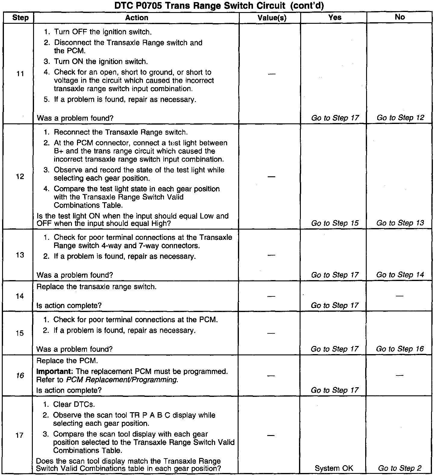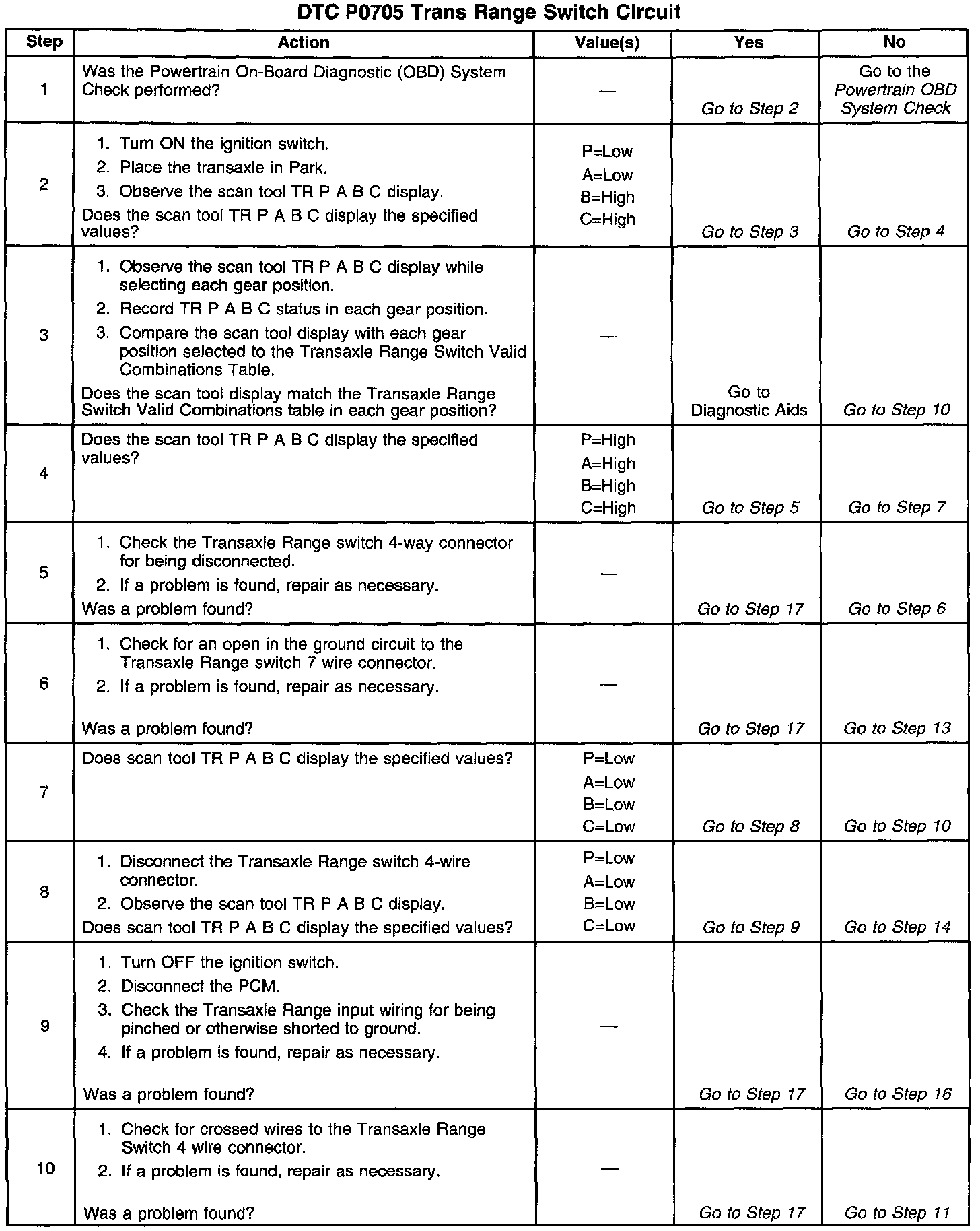 A problem which causes the PCM to detect an invalid transaxle range input combination will set DTC P0705. Valid transaxle range input combinations are shown in the Transaxle Range Switch Valid Input Combinations table.