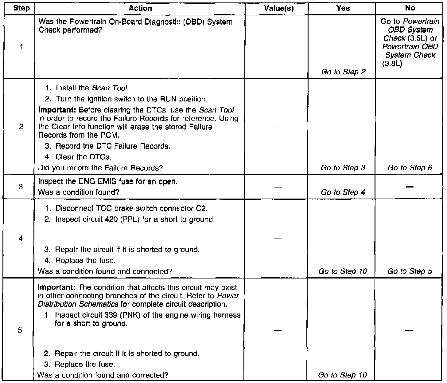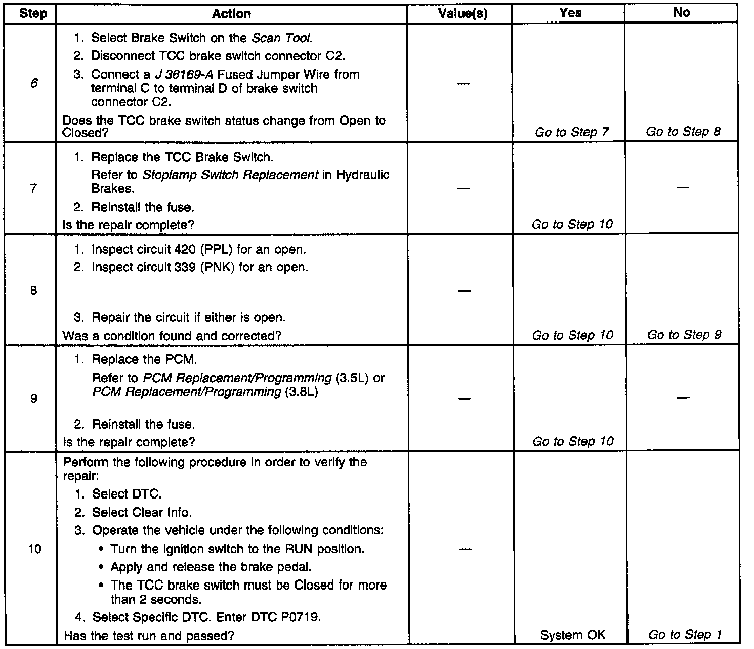 6. This step isolates the fault between the TCC brake switch and the harness.