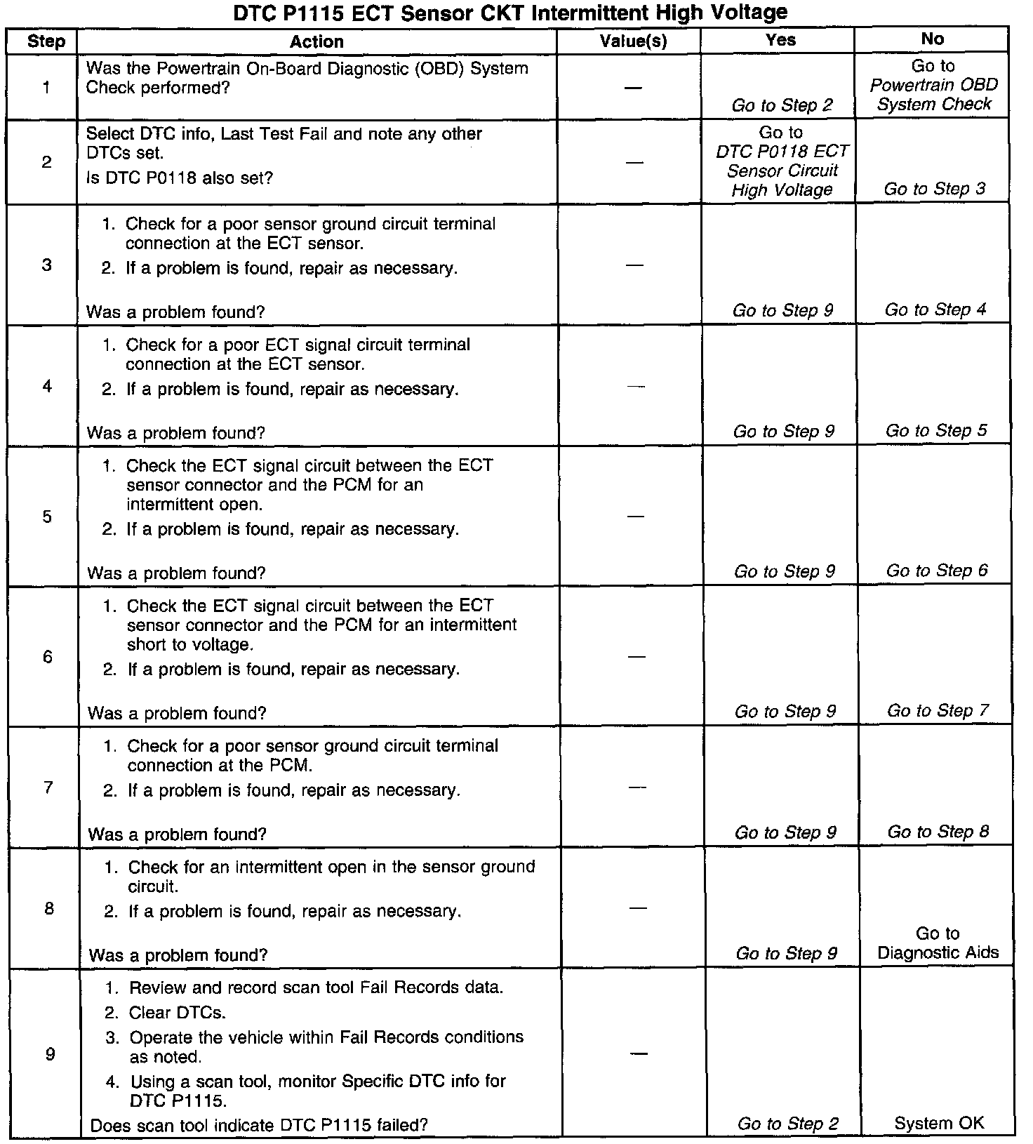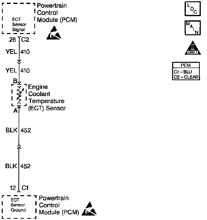 The Engine Coolant Temperature (ECT) sensor is a thermistor mounted in the engine coolant stream. The Powertrain Control Module (PCM) applies a voltage (about 5.0 volts) to the ECT sensor through a pull up resistor. When the engine coolant is cold, the sensor (thermistor) resistance is high; therefore, the PCM will measure a high signal voltage. As the engine coolant warms, the sensor resistance becomes less, and the ECT signal voltage measured at the PCM drops. With a fully warmed up engine, the ECT signal voltage should measure about 1.5 to 2.0 volts. If the PCM detects an ECT signal voltage that is intermittently greater than the range of the ECT sensor, DTC Pills will set.