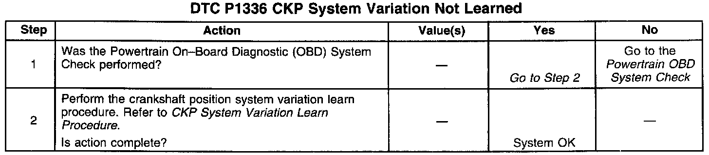 The crankshaft position system variation values are stored in the PCM non-volatile memory after a learn procedure has been performed. DTC P1336 set indicates that the crankshaft position system variation values have not been stored in the PCM and the crankshaft position system variation learn procedure must be performed. The learn procedure is required after the following service procedures have been performed, regardless of whether or not DTC P1336 is set: