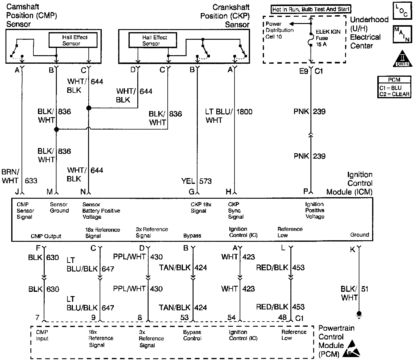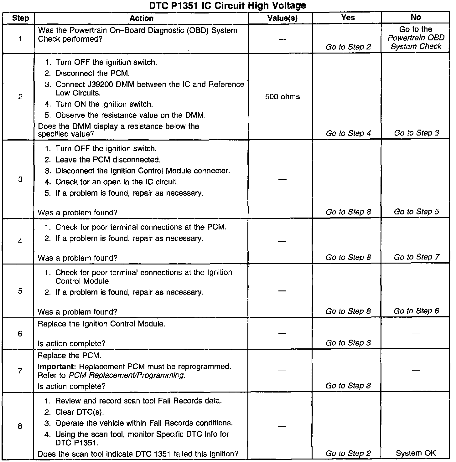 The Powertrain Control Module (PCM) continuously sends ignition control (IC) spark timing pulses to the Ignition Control Module (ICM) on the Ignition Control (IC) circuit. However, during start-up, the ignition control module (ICM) grounds the IC spark timing pulses, and maintains spark timing fixed at 10°BTDC. The fixed spark timing is maintained until the engine speed is above a specific RPM and the PCM receives a calibrated number of 3X reference pulses from the ICM (Bypass Mode). Once the PCM receives the 3X reference pulses, the PCM applies 5 volts to the ICM on the Bypass circuit. The bypass voltage signals the ICM to transfer ignition control (IC) spark timing to the PCM (IC Mode). The ICM switches the IC pulses from ground allowing the PCM to control spark timing. If the PCM detects an open in the IC circuit, DTC P1351 will set. The engine will start and may run in Bypass mode timing (spark timing fixed at 10°BTDC).
