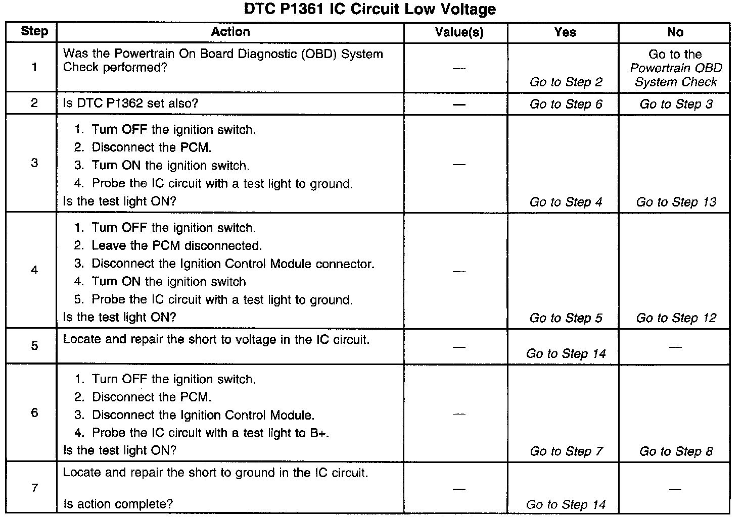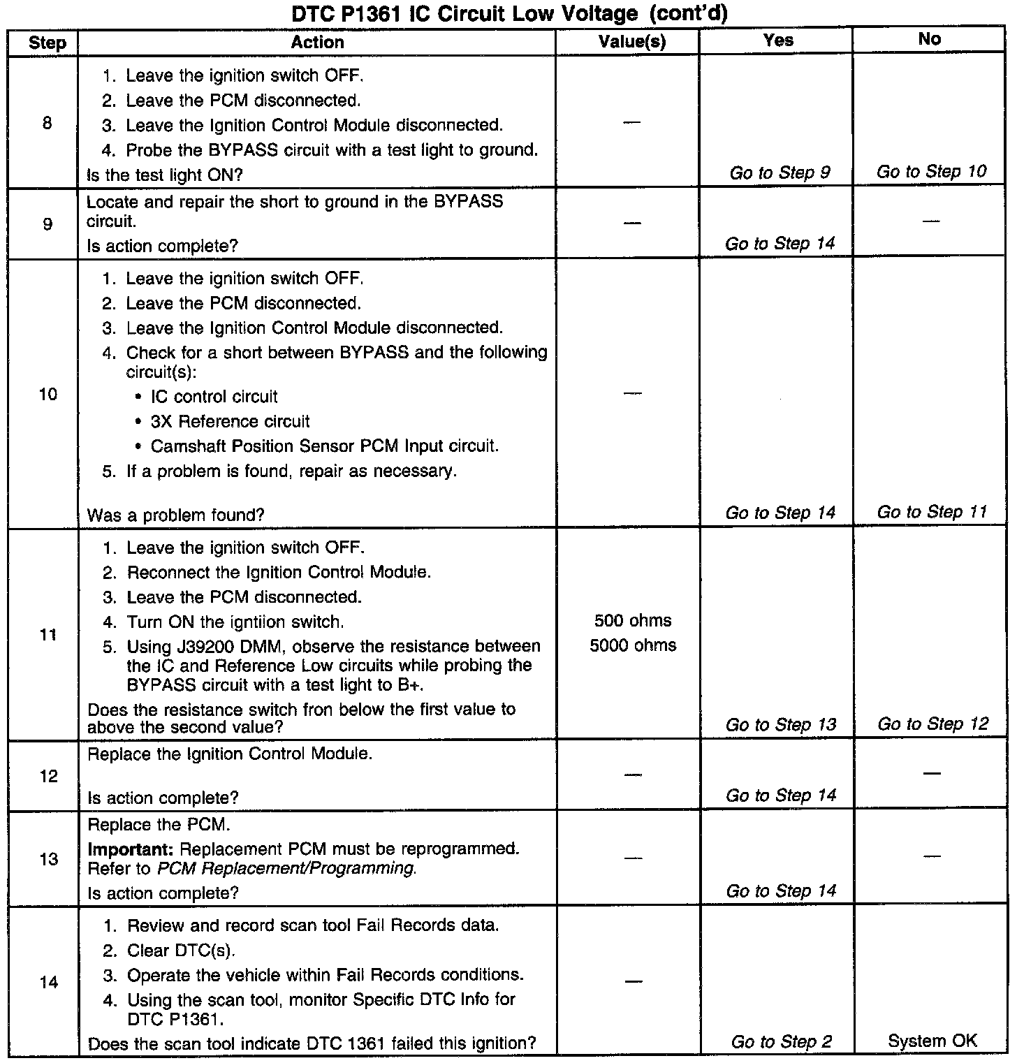 The Powertrain Control Module (PCM) continuously sends ignition control (IC) spark timing pulses to the Ignition Control Module (ICM) on the Ignition Control (IC) circuit. However, during start-up, the ignition control module (ICM) grounds the IC spark timing pulses, and maintains spark timing fixed at 10°BTDC. The fixed spark timing is maintained until the engine speed is above a specific RPM and the PCM receives a calibrated number of 3X reference pulses from the ICM (Bypass Mode). Once the PCM receives the 3X reference pulses, the PCM applies 5 volts to the ICM on the Bypass circuit. The bypass voltage signals the ICM to transfer ignition control (IC) spark timing to the PCM (IC Mode). The ICM switches the IC pulses from ground allowing the PCM to control spark timing. If the PCM detects a short to voltage in the IC circuit, DTC P1361 will set. A short to ground in the IC circuit or Bypass circuit will cause both DTC P1361 and DTC P1362 to set. The engine will start and may run in Bypass mode timing (spark timing fixed at 10°BTDC).