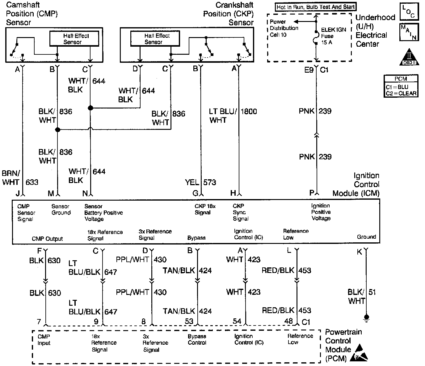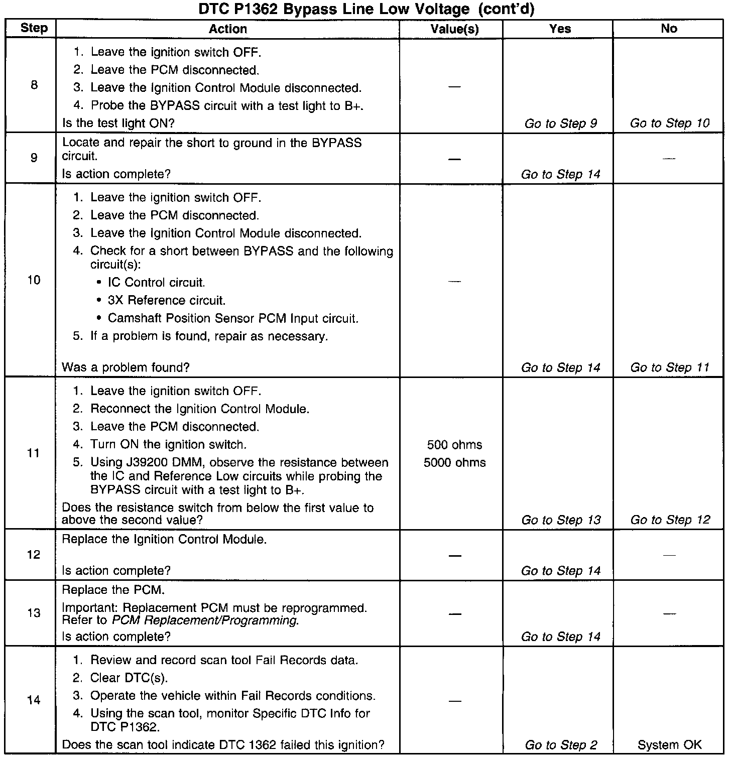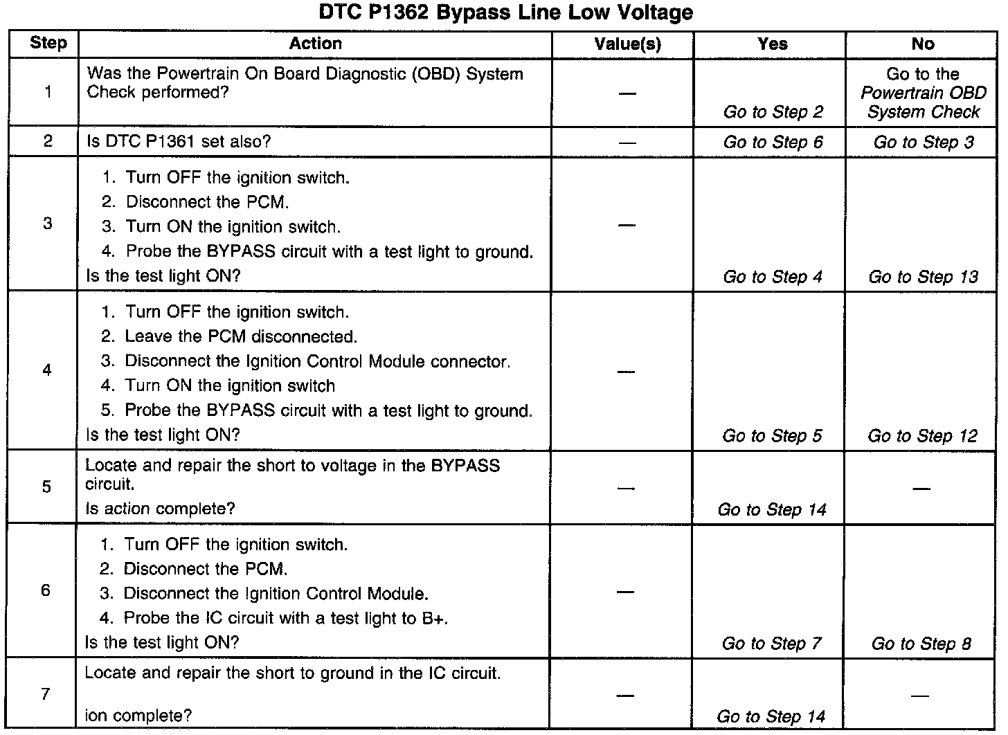 The Powertrain Control Module (PCM) continuously sends ignition control (IC) spark timing pulses to the Ignition Control Module (ICM) on the Ignition Control (IC) circuit. However, during start-up, the ignition control module (ICM) grounds the IC spark timing pulses, and maintains spark timing fixed at 10°BTDC. The fixed spark timing is maintained until the engine speed is above a specific RPM and the PCM receives a calibrated number of 3X reference pulses from the ICM (Bypass Mode). Once the PCM receives the 3X reference pulses, the PCM applies 5 volts to the ICM on the Bypass circuit. The bypass voltage signals the ICM to transfer ignition control (IC) spark timing to the PCM (IC Mode). The ICM switches the IC pulses from ground allowing the PCM to control spark timing. If the PCM detects a short to voltage in the Bypass circuit, DTC P1362 will set. A short to ground in the IC circuit or Bypass circuit will cause both DTC P1361 and DTC P1362 to set. The engine will start and may run in Bypass mode timing (spark timing fixed at 10°BTDC).