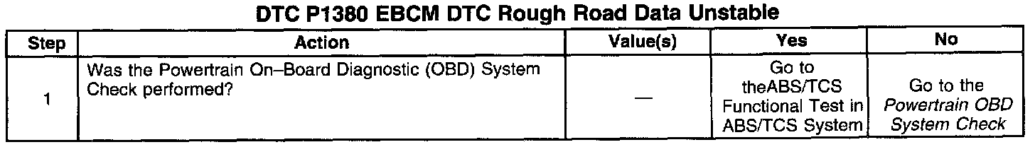 DTC P1380 set indicates that the ABS / TCS system has detected a malfunction which will not allow the EBCM / EBTCM to transmit correct rough road data to the PCM. The ABS/TCS Functional Test in ABS/TCS Diagnosis should be used to diagnose this condition.