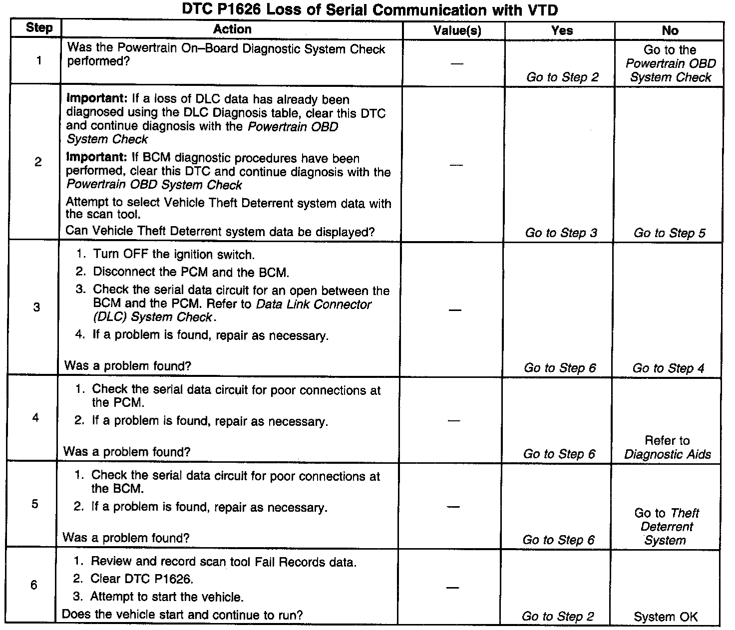 The Vehicle Theft Deterrent (VTD) system is incorporated within the Body Control Module (BCM). The Powertrain Control Module (PCM) monitors the state of health serial data message from the theft deterrent system to ensure that the PCM - BCM communications is established. If the PCM detects a loss of the state of health message while the engine is running, DTC P1626 will be set. DTC P1626 can cause a no-start condition or normal operation depending on when the loss of system communication was detected. The engine will continue to start and run if the condition that set DTC P1626 occurred after the PCM received a valid VTD password from the BCM and already allowed fuel during the ignition cycle. The engine will not start or crank if the condition that set DTC P1626 occurred before the PCM received a valid VTD password. With this condition present, the PCM will inhibit fuel delivery and disable the starter until a valid VTD password is detected.