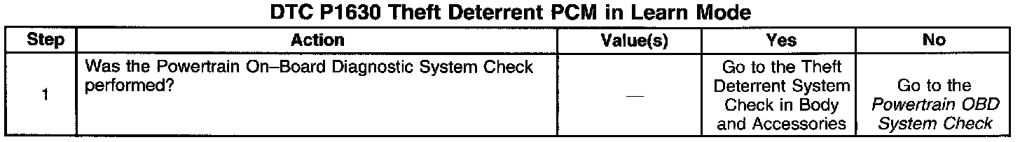 The Vehicle Theft Deterrent system (VTD) is incorporated within the Body Control Module (BCM). If the BCM has been replaced, the password must be relearned using approved Techline diagnostic equipment. If the Powertrain Control Module (PCM) is replaced, the replacement PCM should learn the password within a few seconds after the ignition is turned ON. DTC P1630 is an information code indicating that the PCM is ready to learn the VTD password. The engine will start and continue to run with DTC P1630 set. Refer to Vehicle Theft Deterrent System for further information regarding the VTD system.