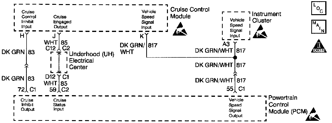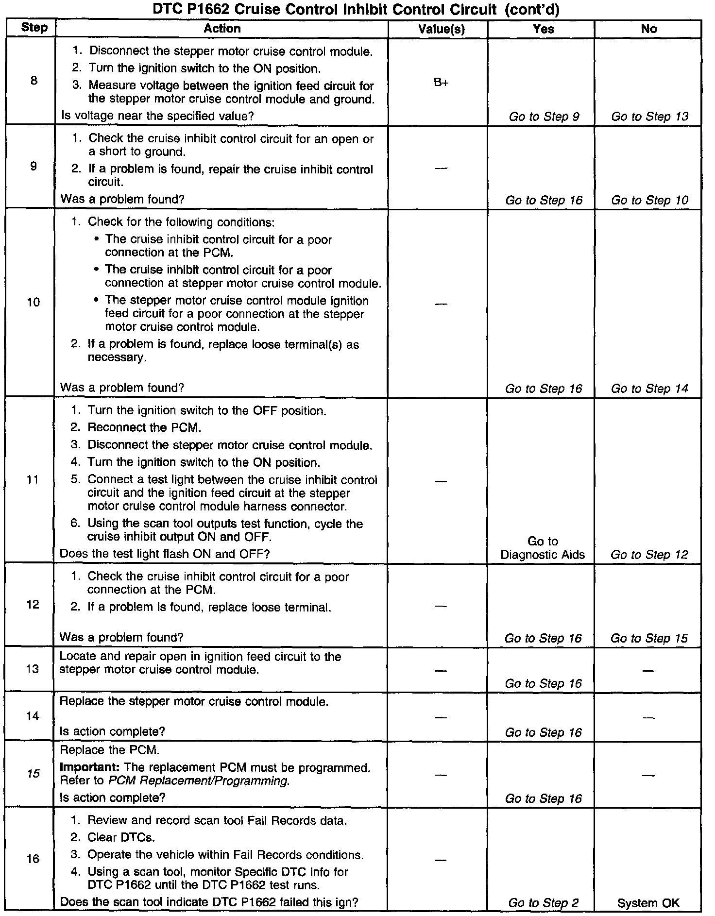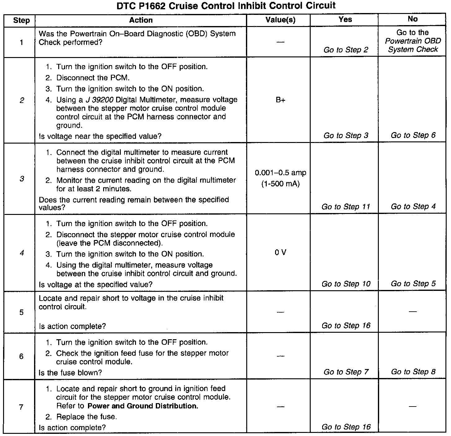 Output Driver Modules (ODMs) are used by the Powertrain Control Module (PCM) to turn on many of the current-driven devices that are needed to control various engine and Transaxle functions. Each ODM is capable of controlling up to 7 separate outputs by applying ground to the device which the PCM is commanding ON. Unlike the Quad Driver Modules (QDMs) used in prior model years, ODMs have the capability of diagnosing each output circuit individually. DTC P1662 set indicates an improper voltage level has been detected on the output circuit which controls the stepper motor cruise control inhibit circuit.